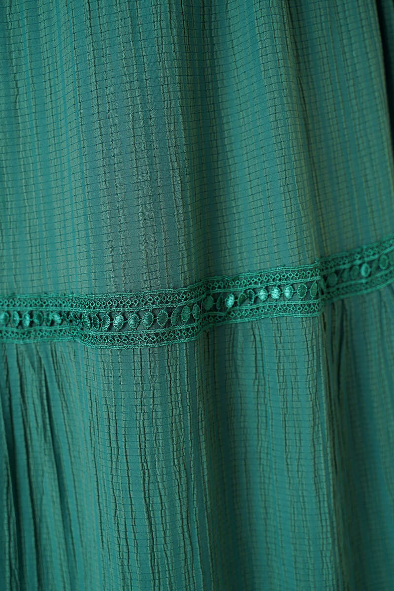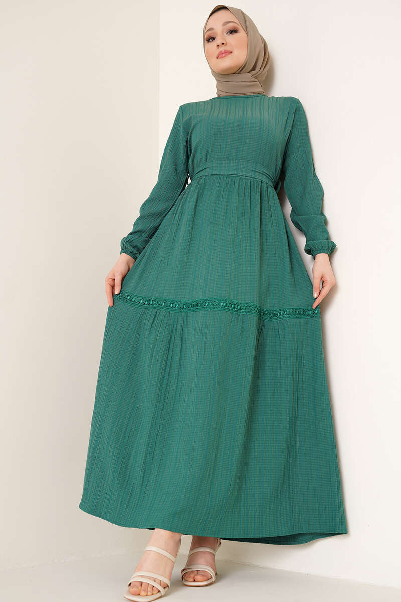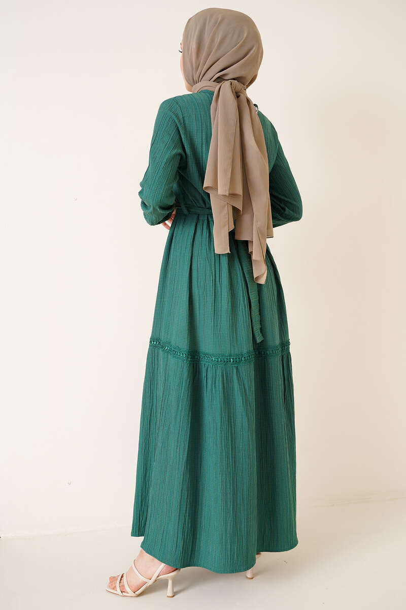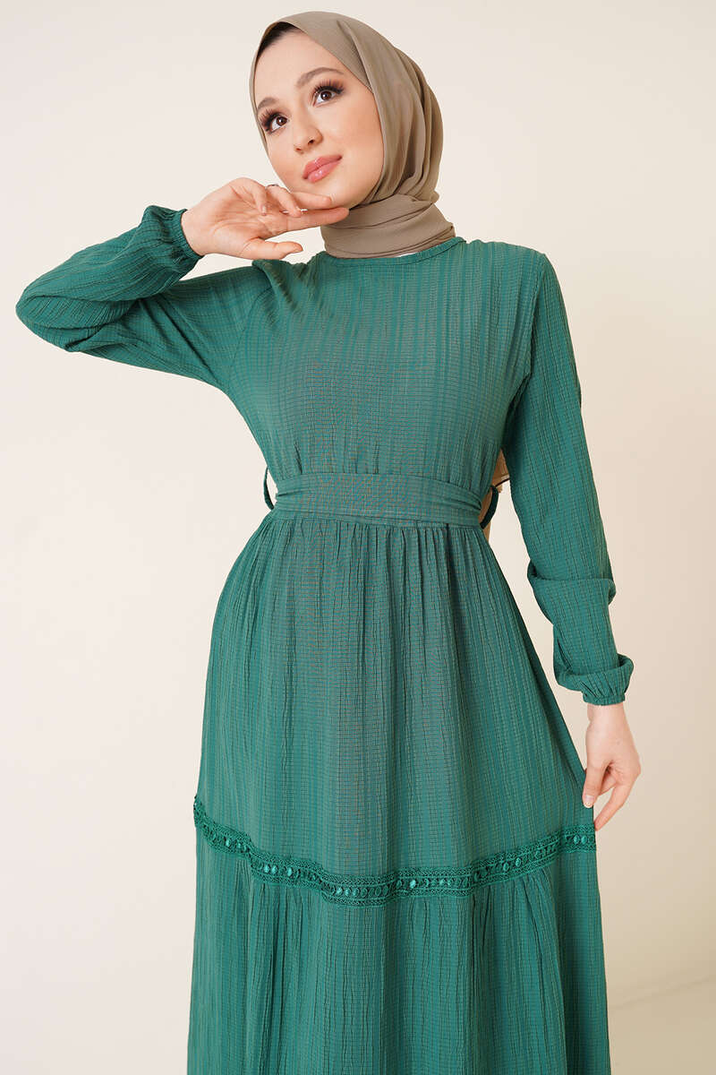 Dantel Süslemeli Kuşaklı Elbise Zümrüt Yeşili