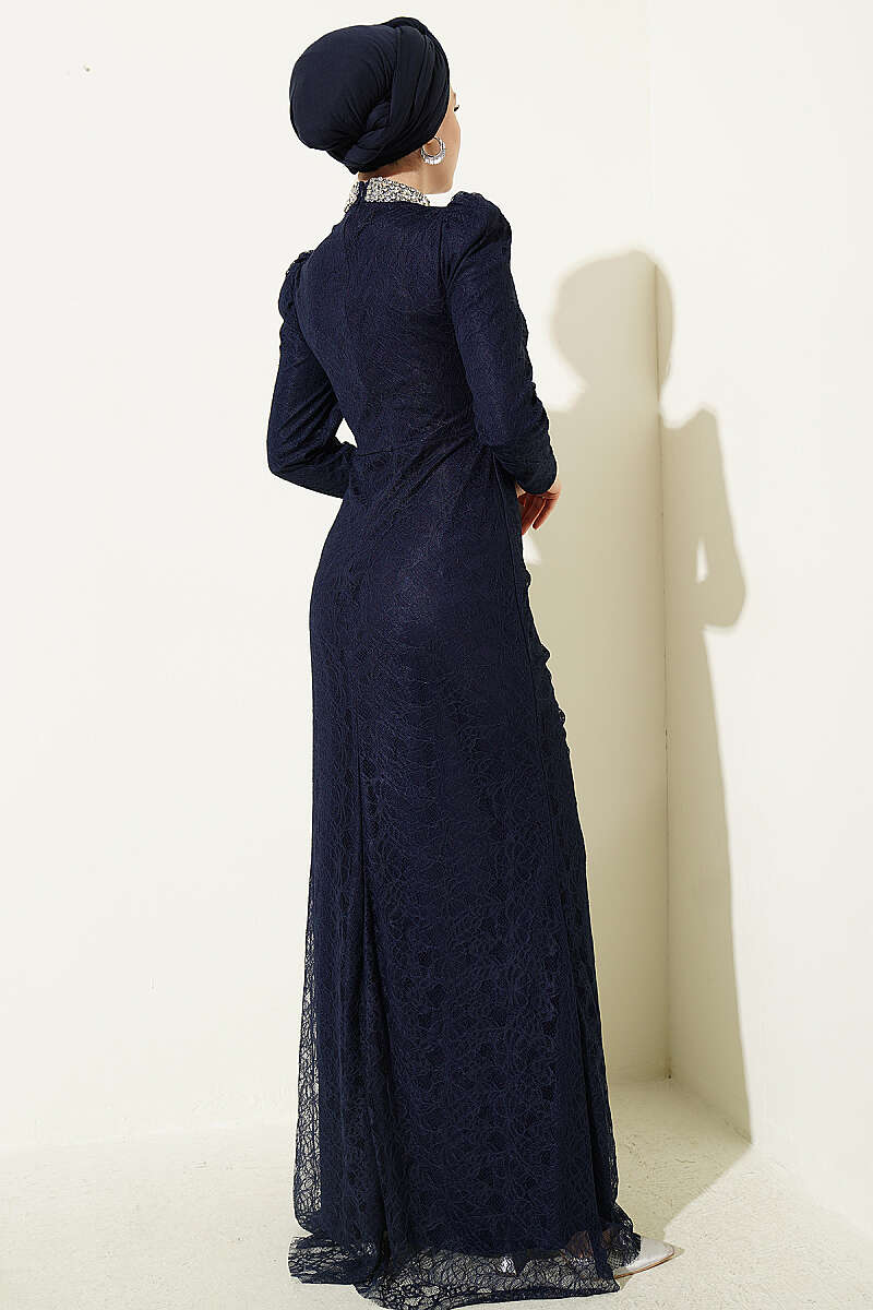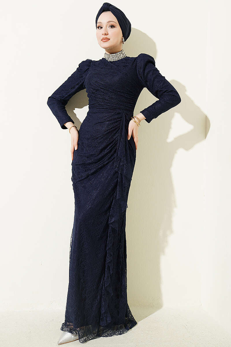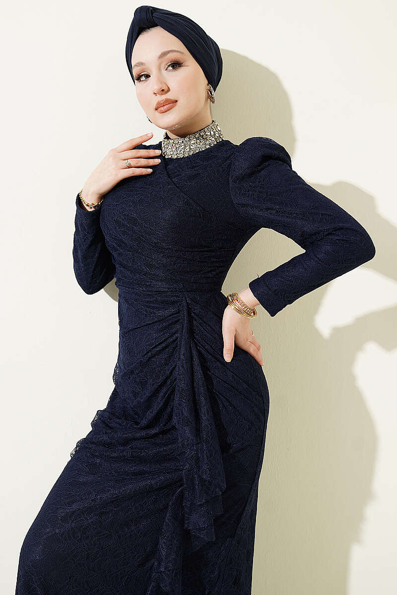 Dantelli Büzgülü Taşlı Abiye Elbise Lacivert