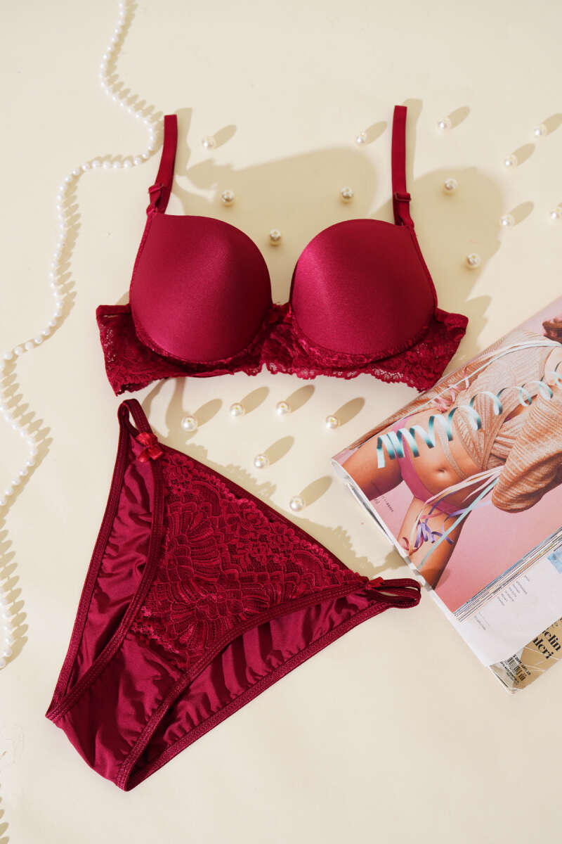 Dantelli Destekli Parlak Sütyen Takım Bordo