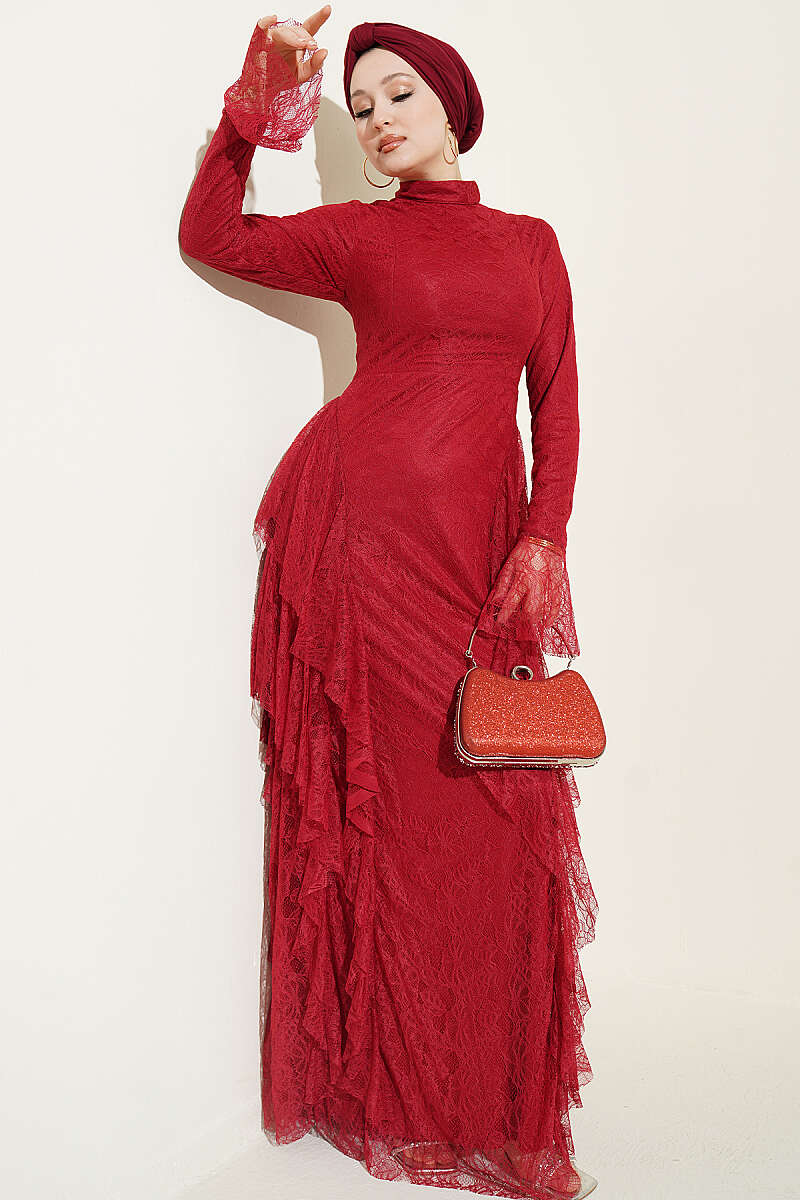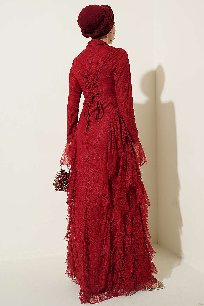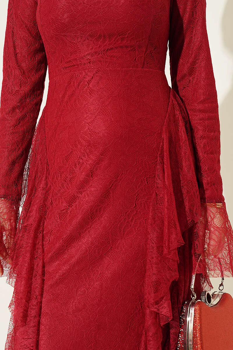 Dantelli Etek Fırfırlı Abiye Elbise Bordo