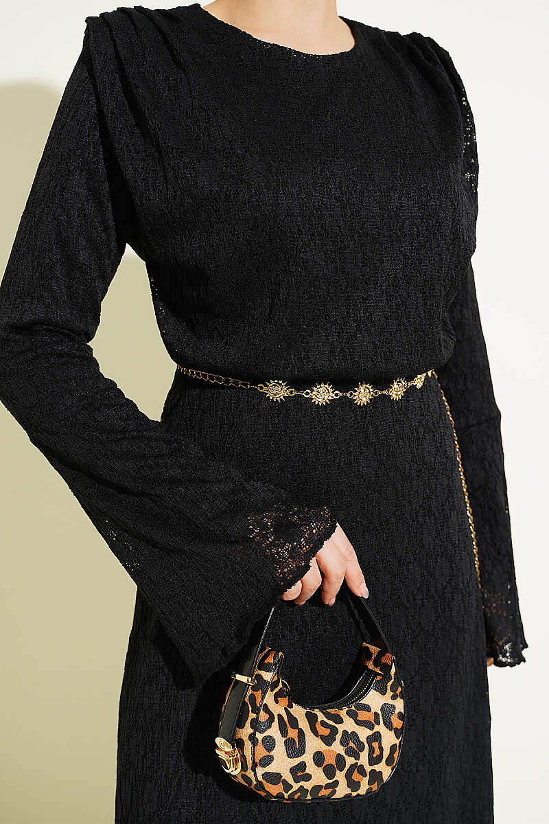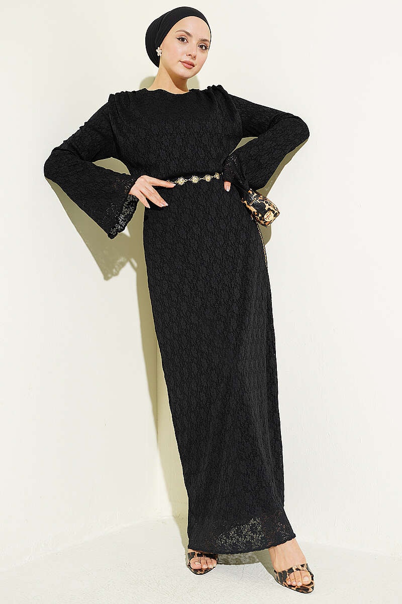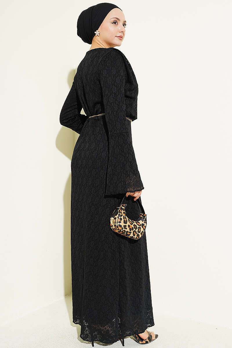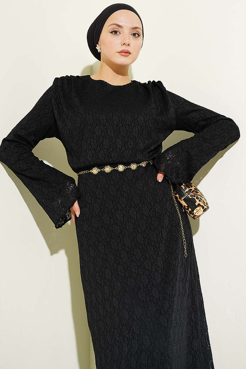 Dantelli Kemerli Elbise Siyah