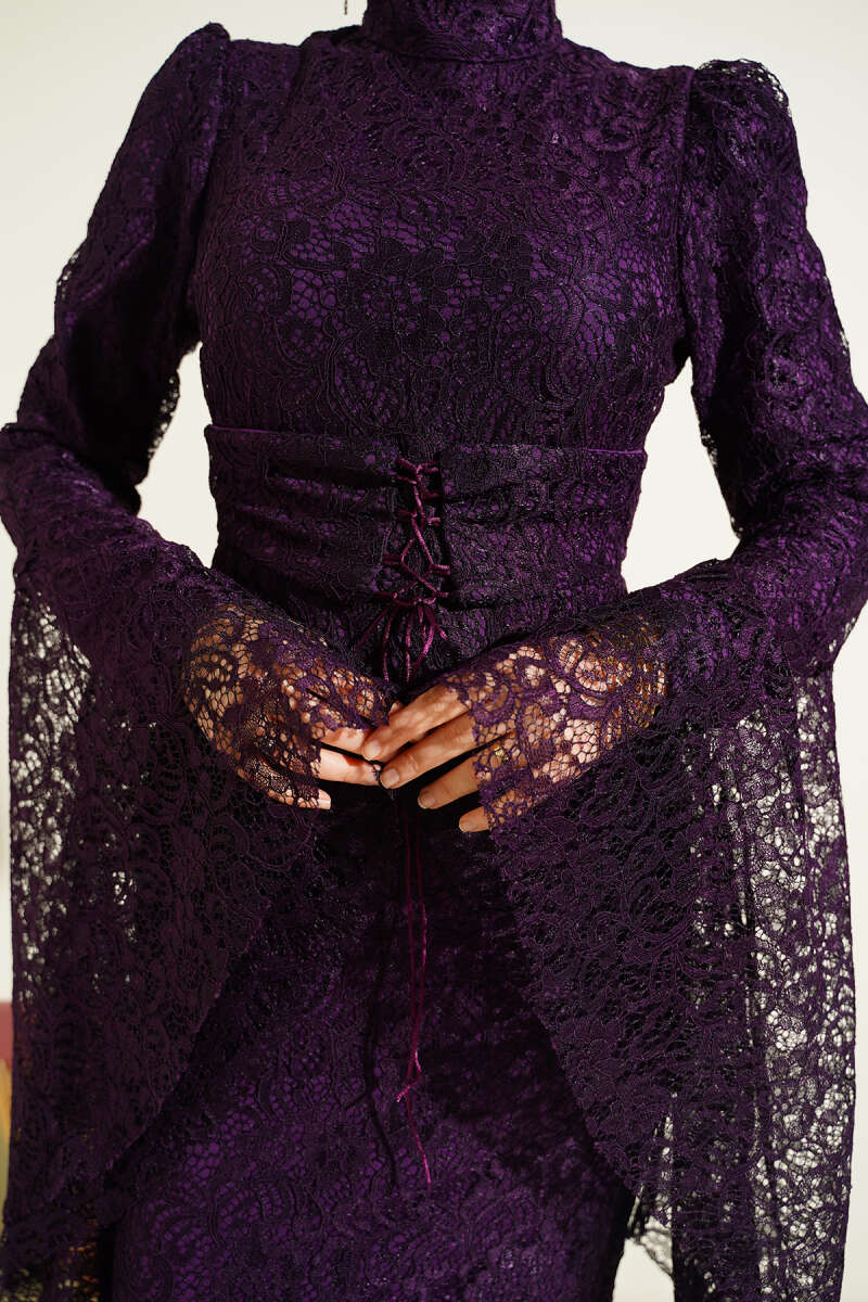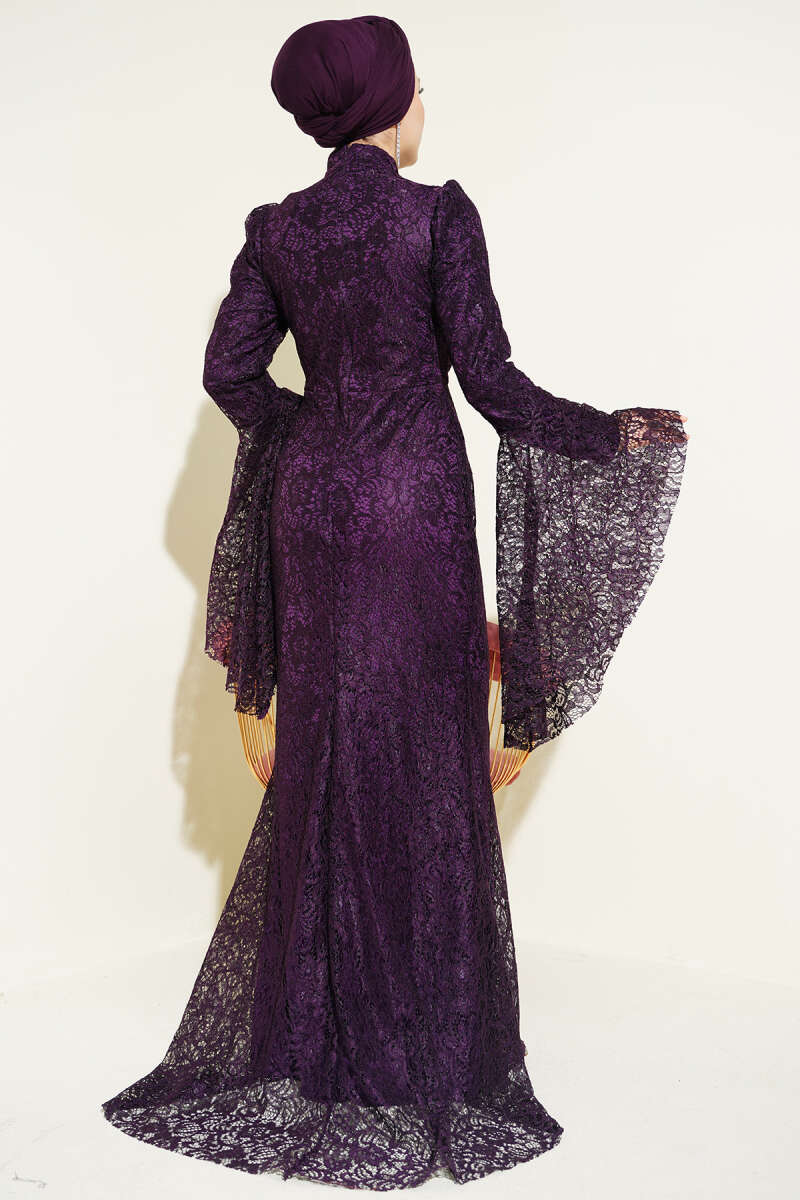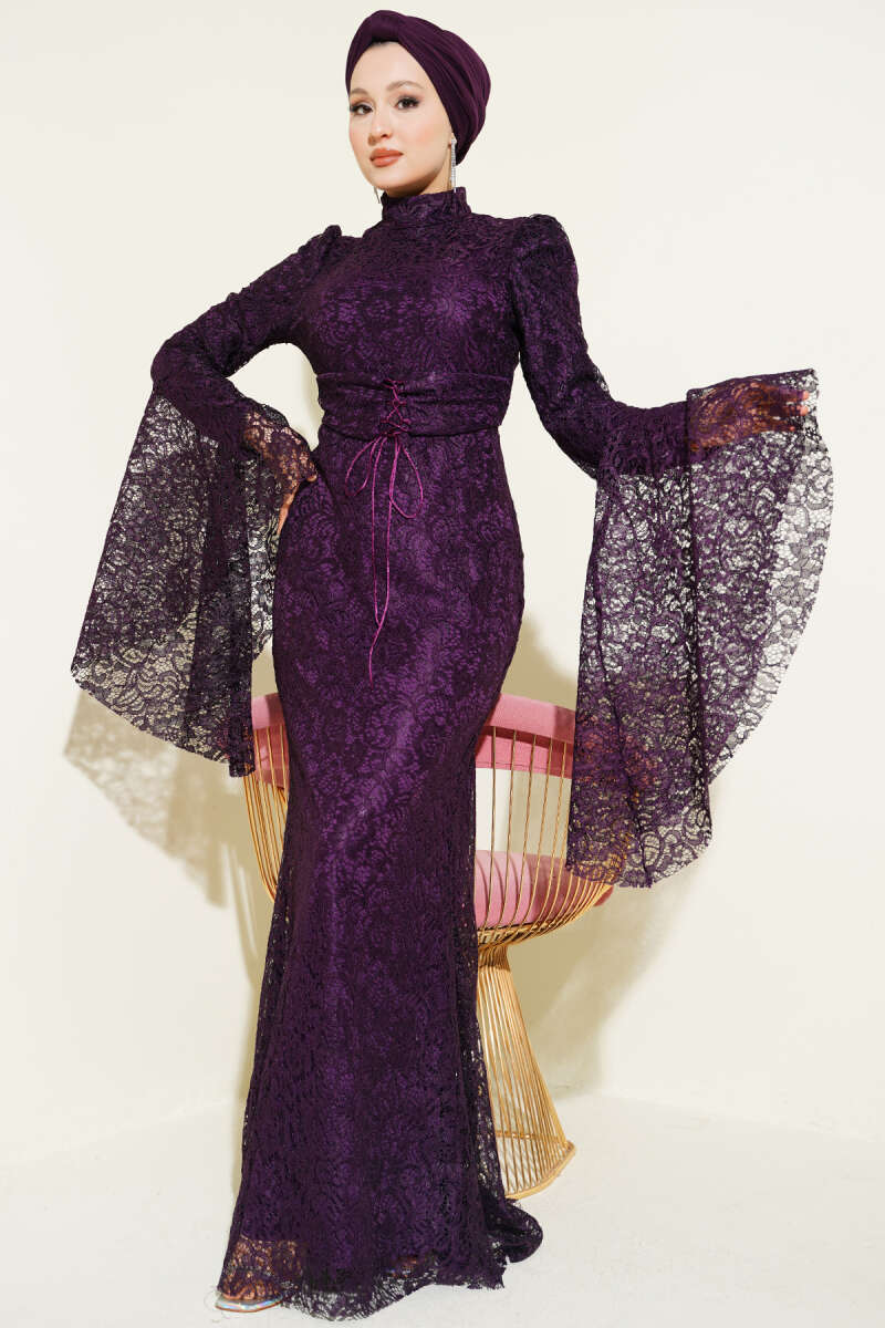 Dantelli Kol Volanlı Balık Model Abiye Mürdüm