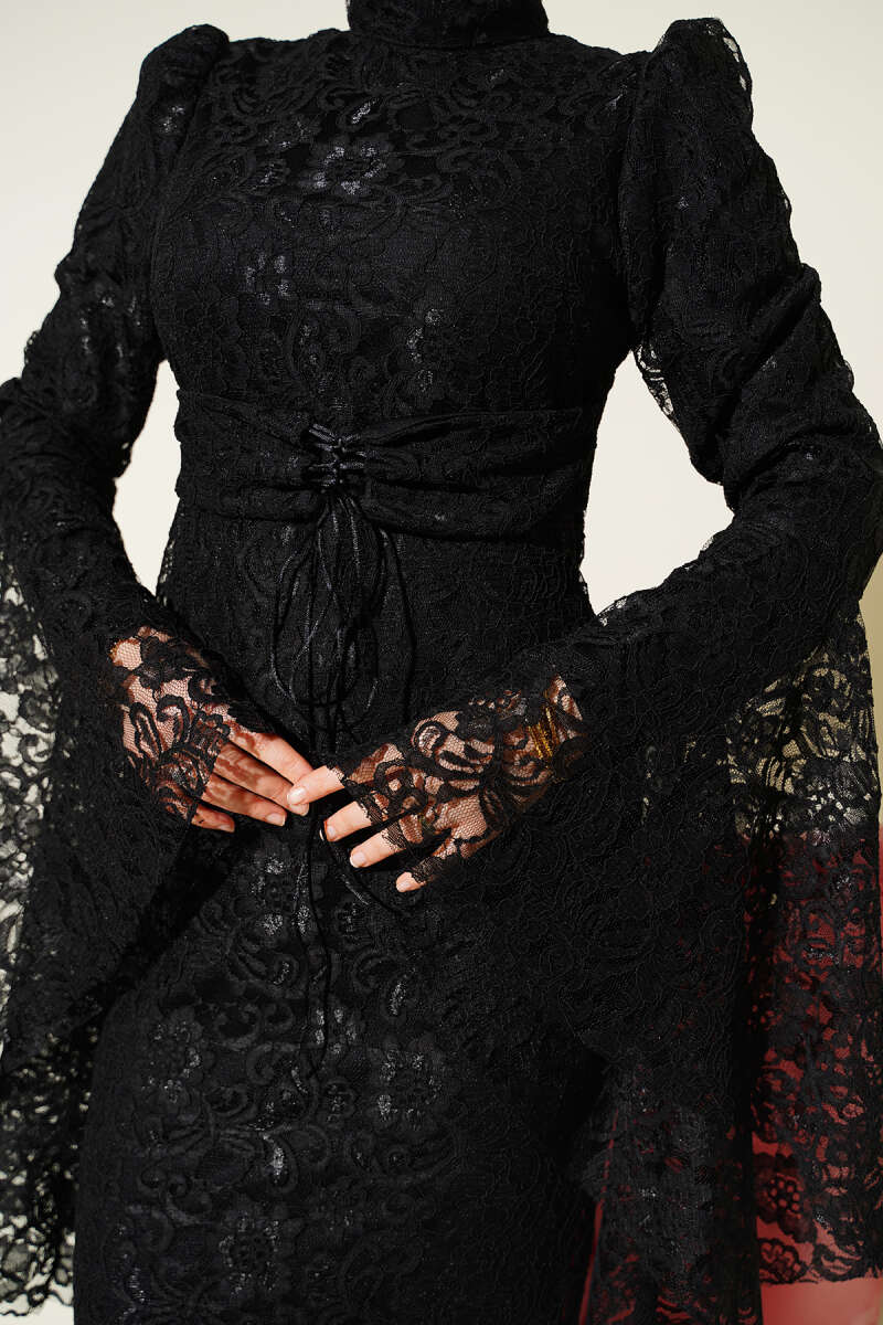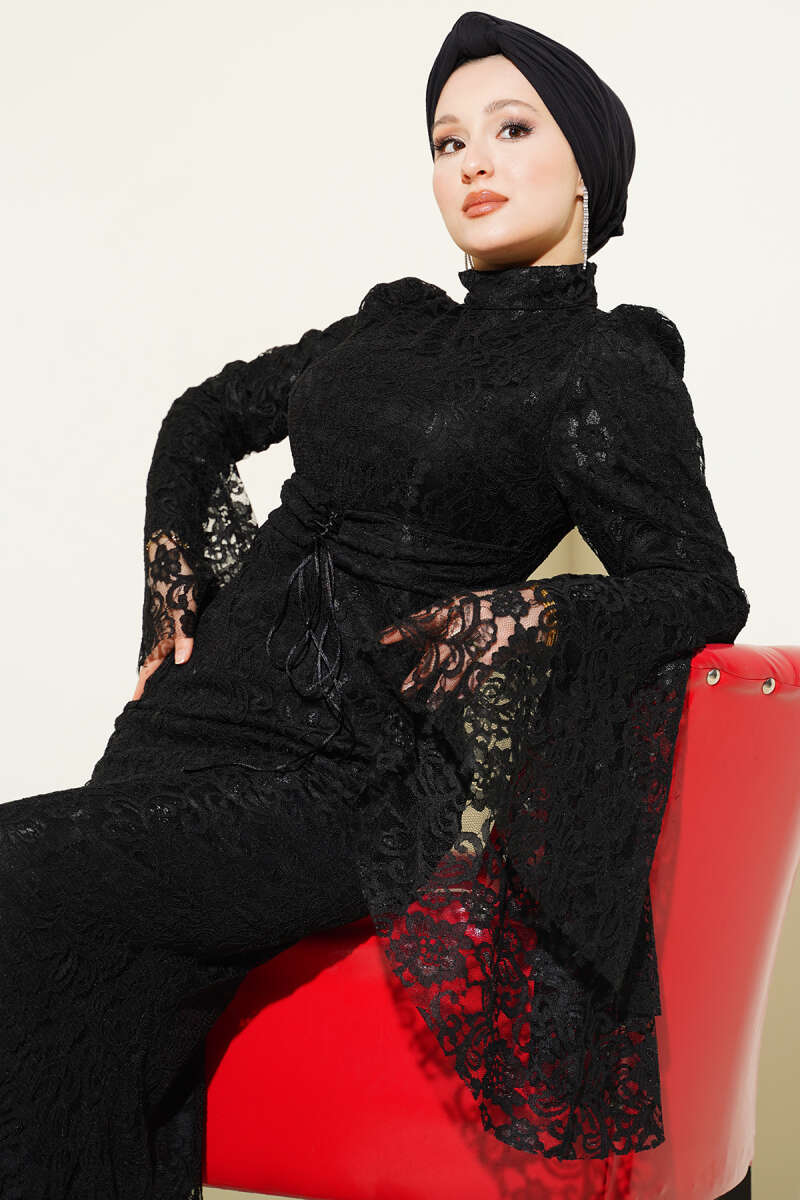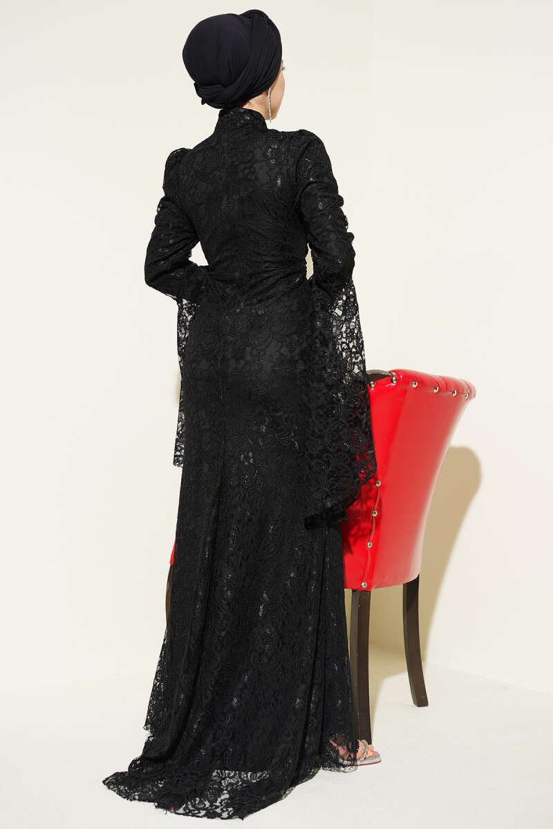Dantelli Kol Volanlı Balık Model Abiye Siyah