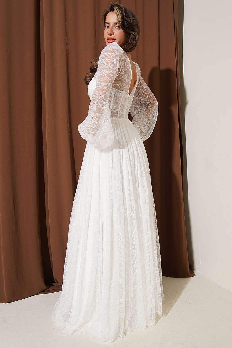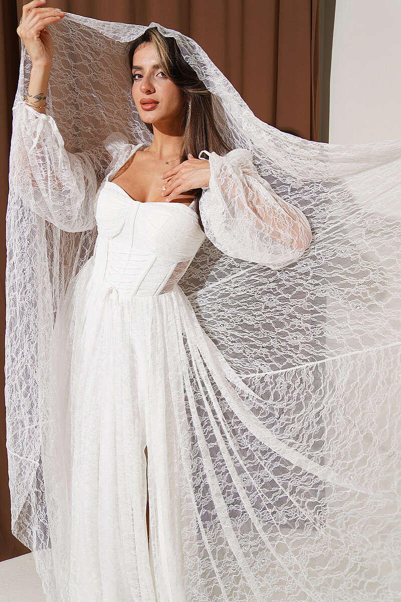 Dantelli Yırtmaçlı Korseli Abiye Elbise Ekru