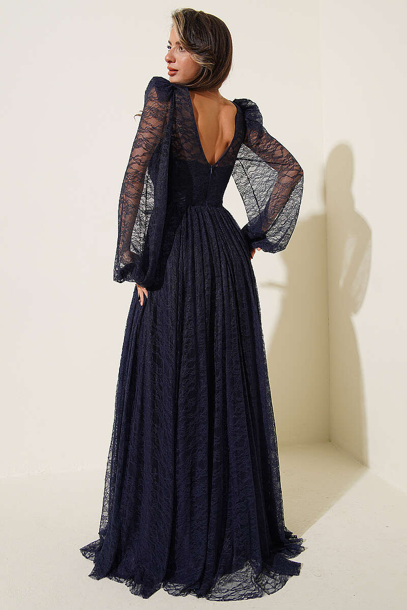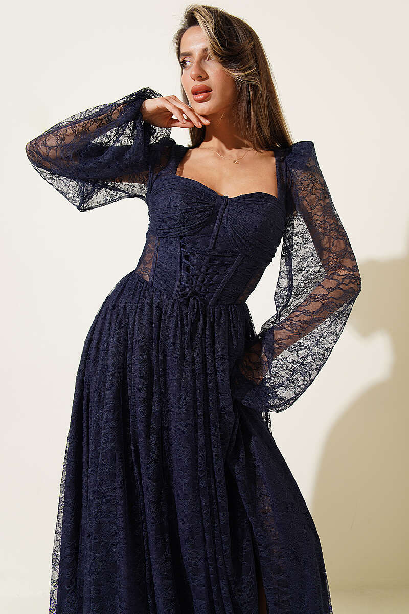 Dantelli Yırtmaçlı Korseli Abiye Elbise Lacivert
