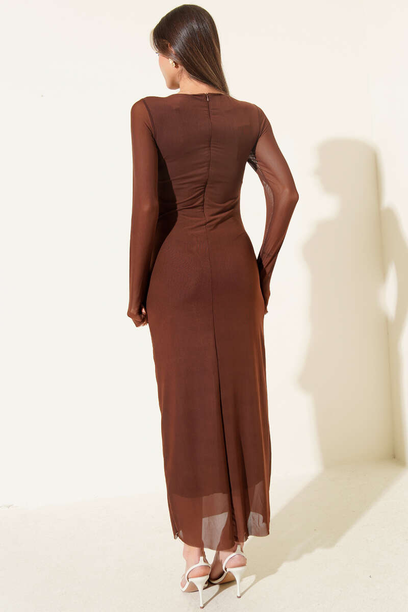 Dantelli Tül Yan Büzgülü Elbise Kahve