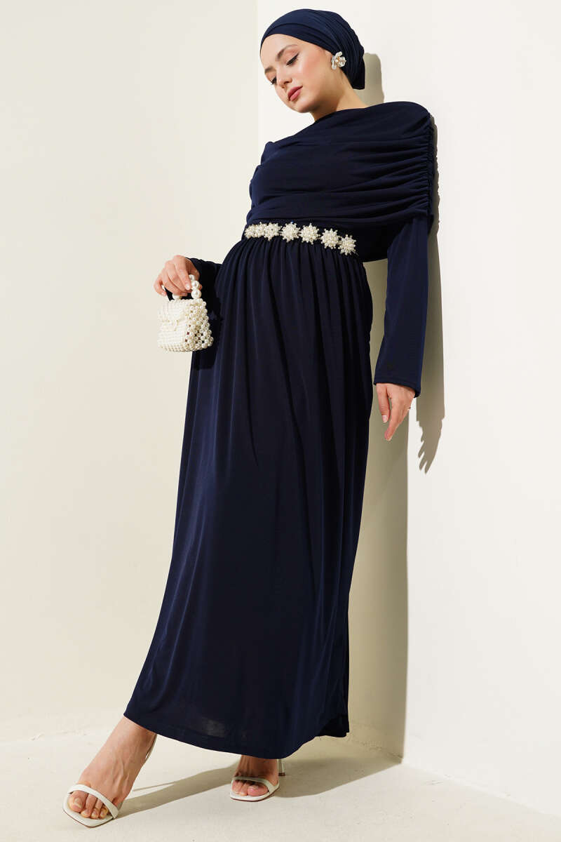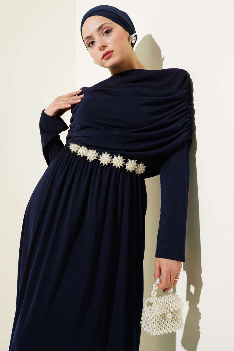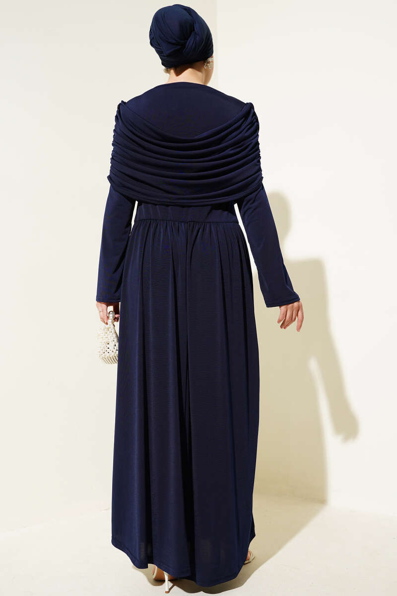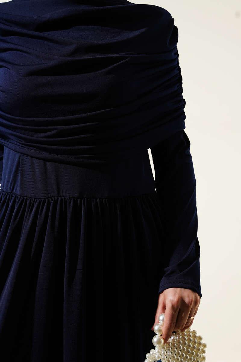 Omuz Pelerinli Taş Detaylı Abiye Elbise Lacivert