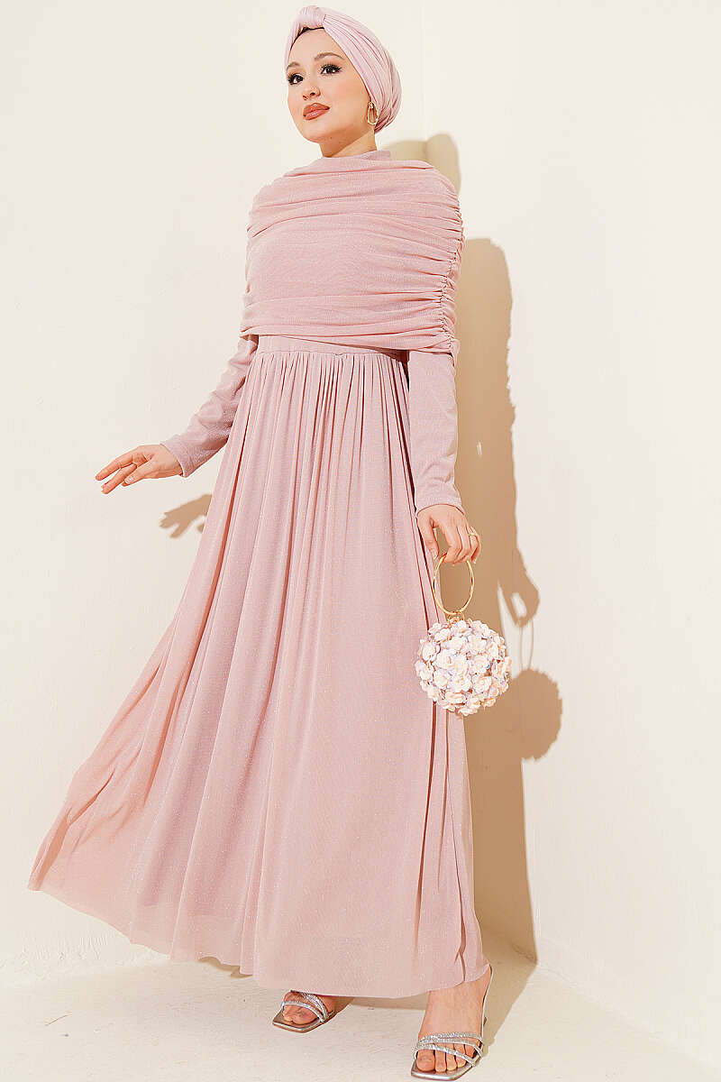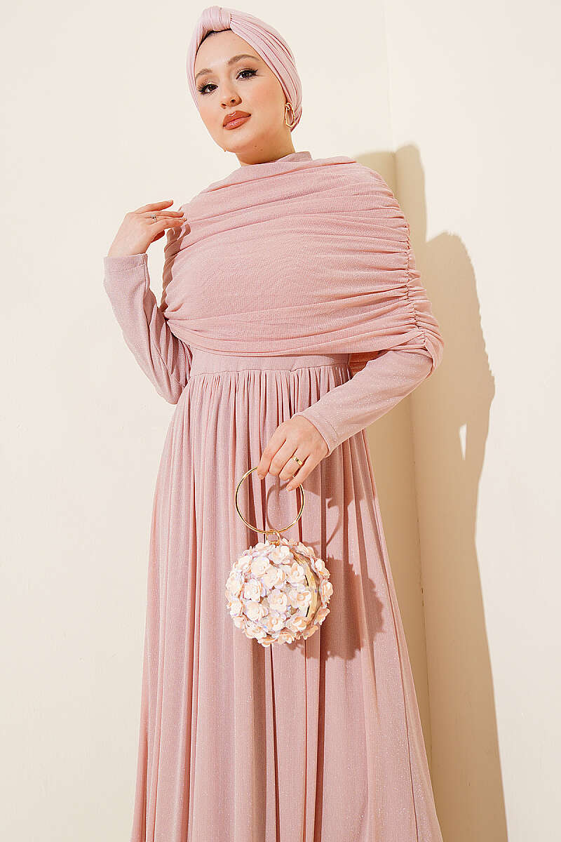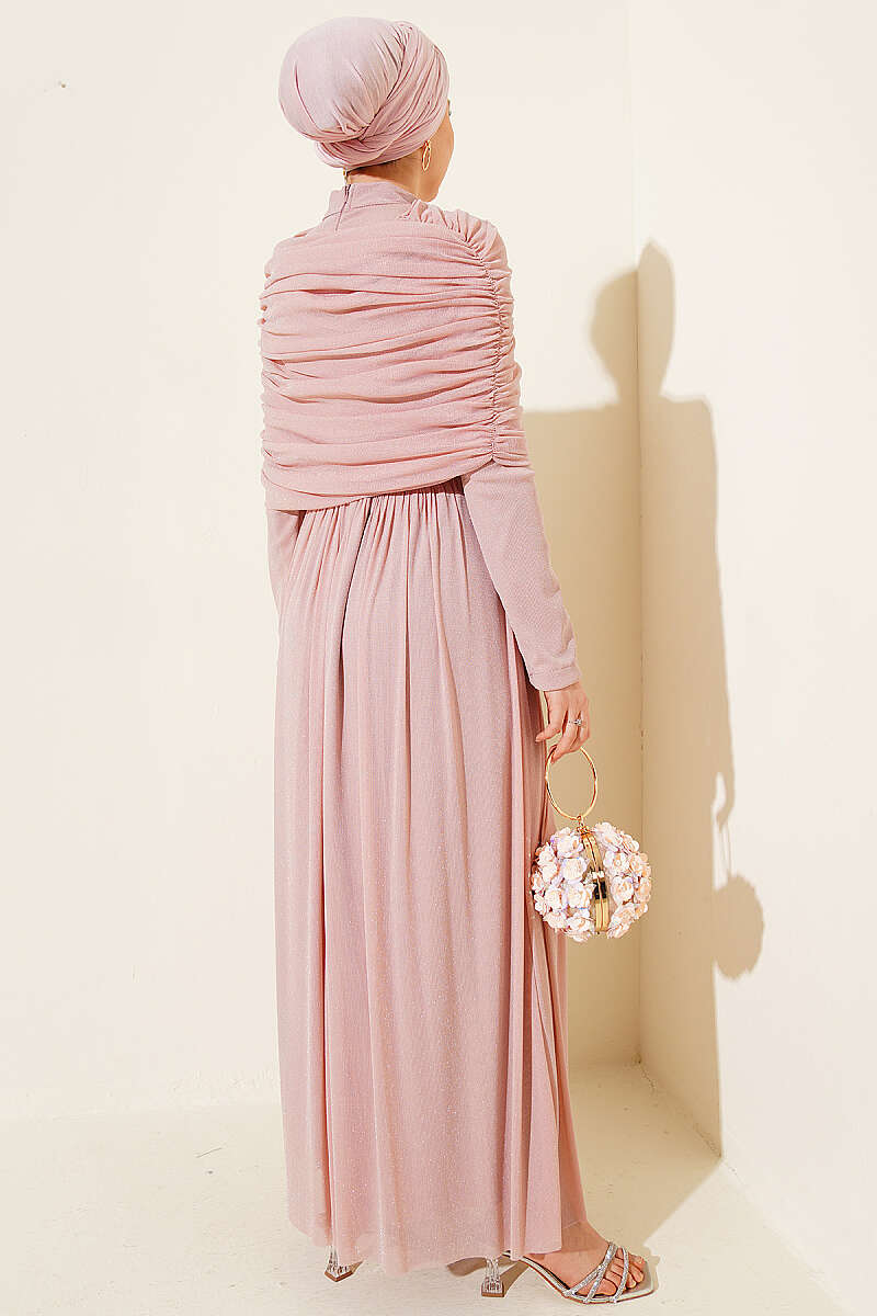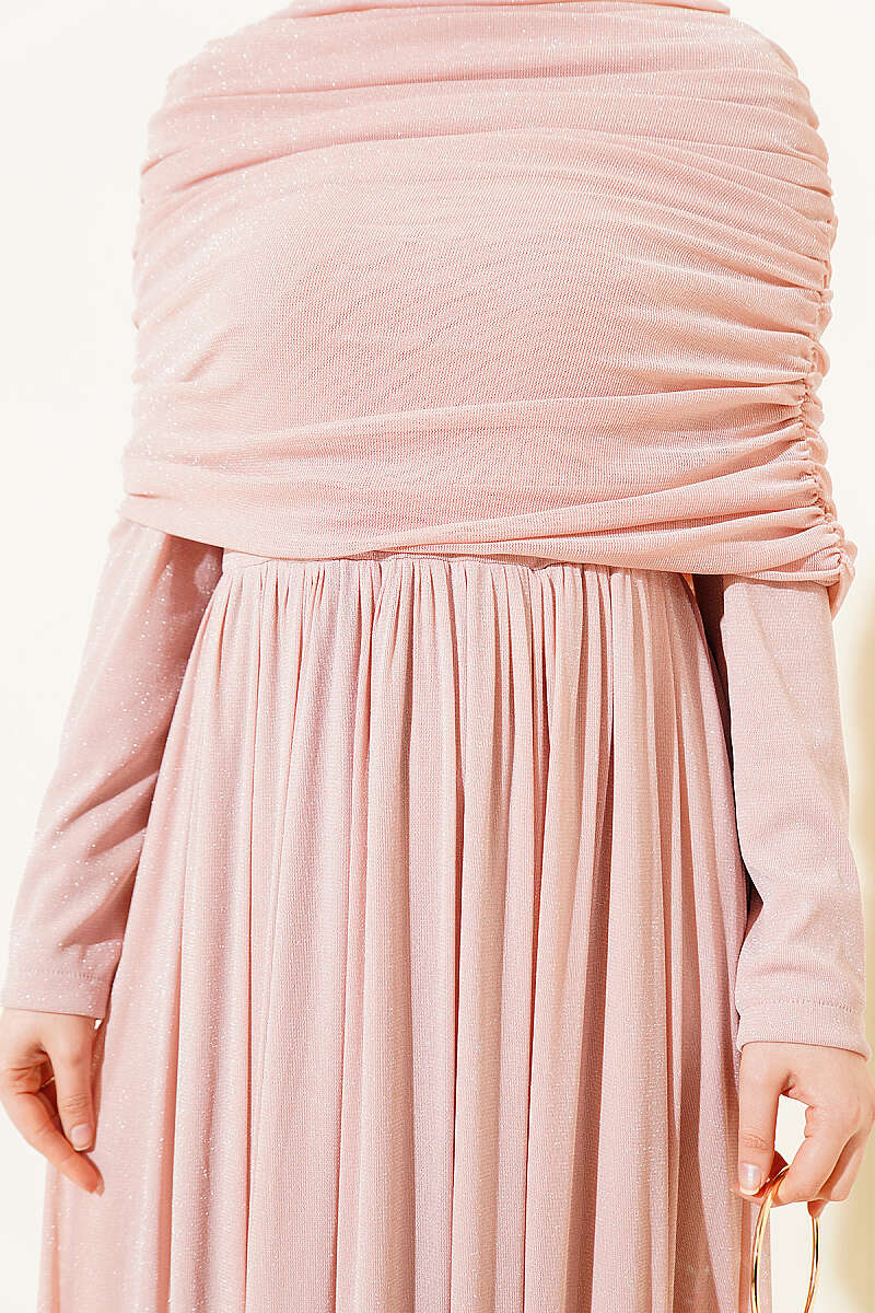 Degaje Yaka Görünümlü Simli Abiye Elbise Pembe