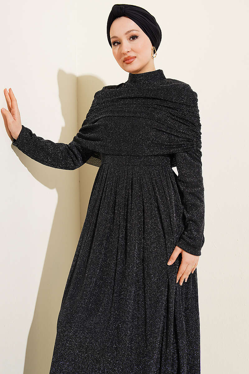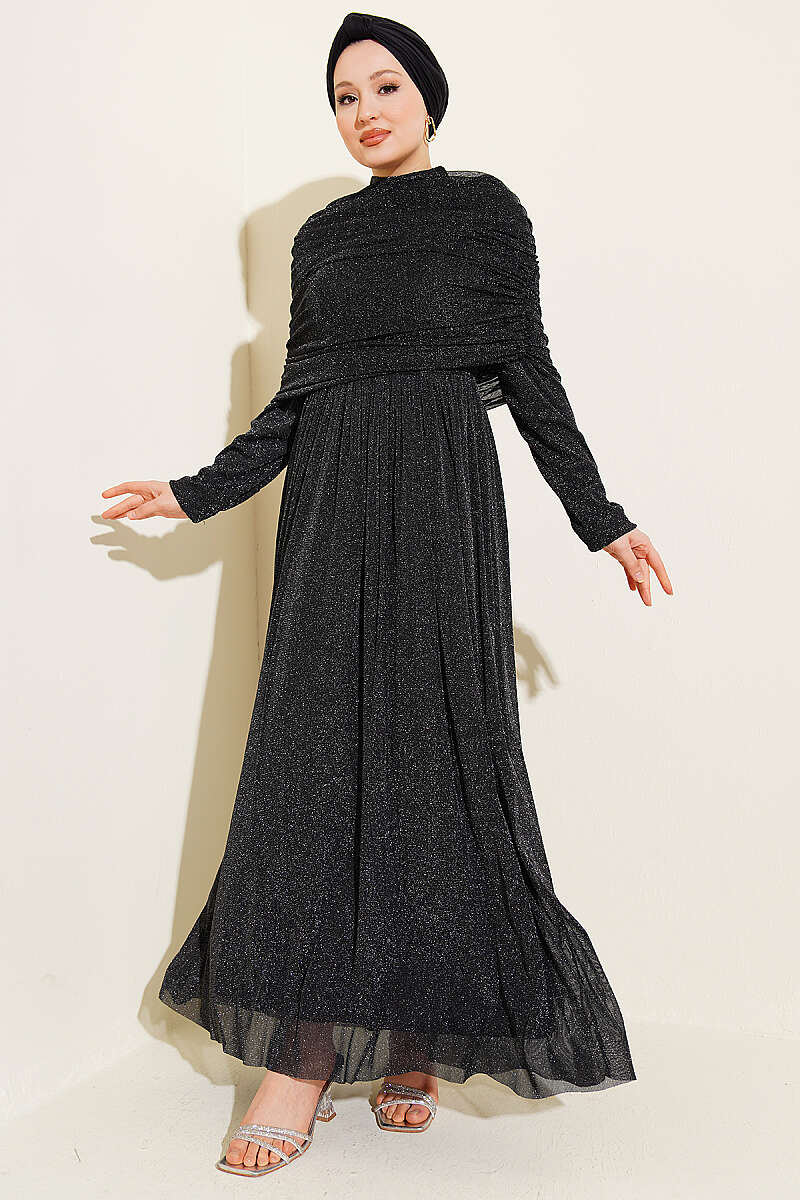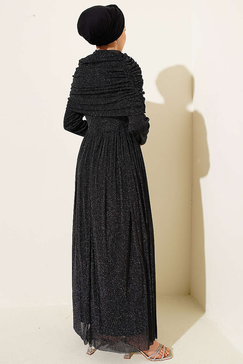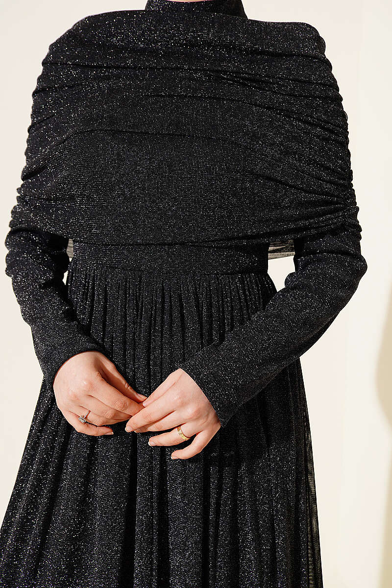 Degaje Yaka Görünümlü Simli Abiye Elbise Siyah