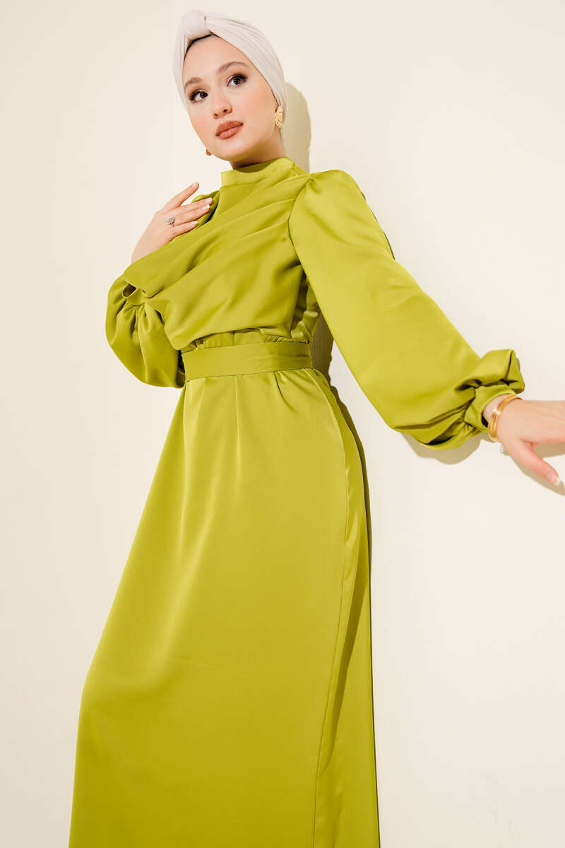 Büzgü Kuşaklı Basic Saten Elbise Bordo