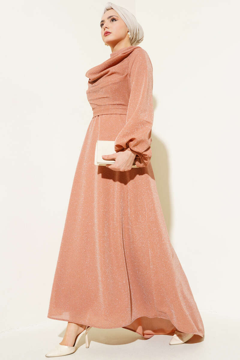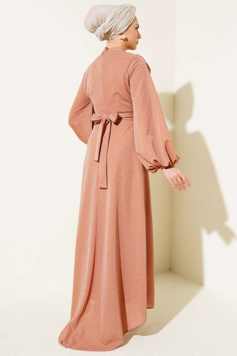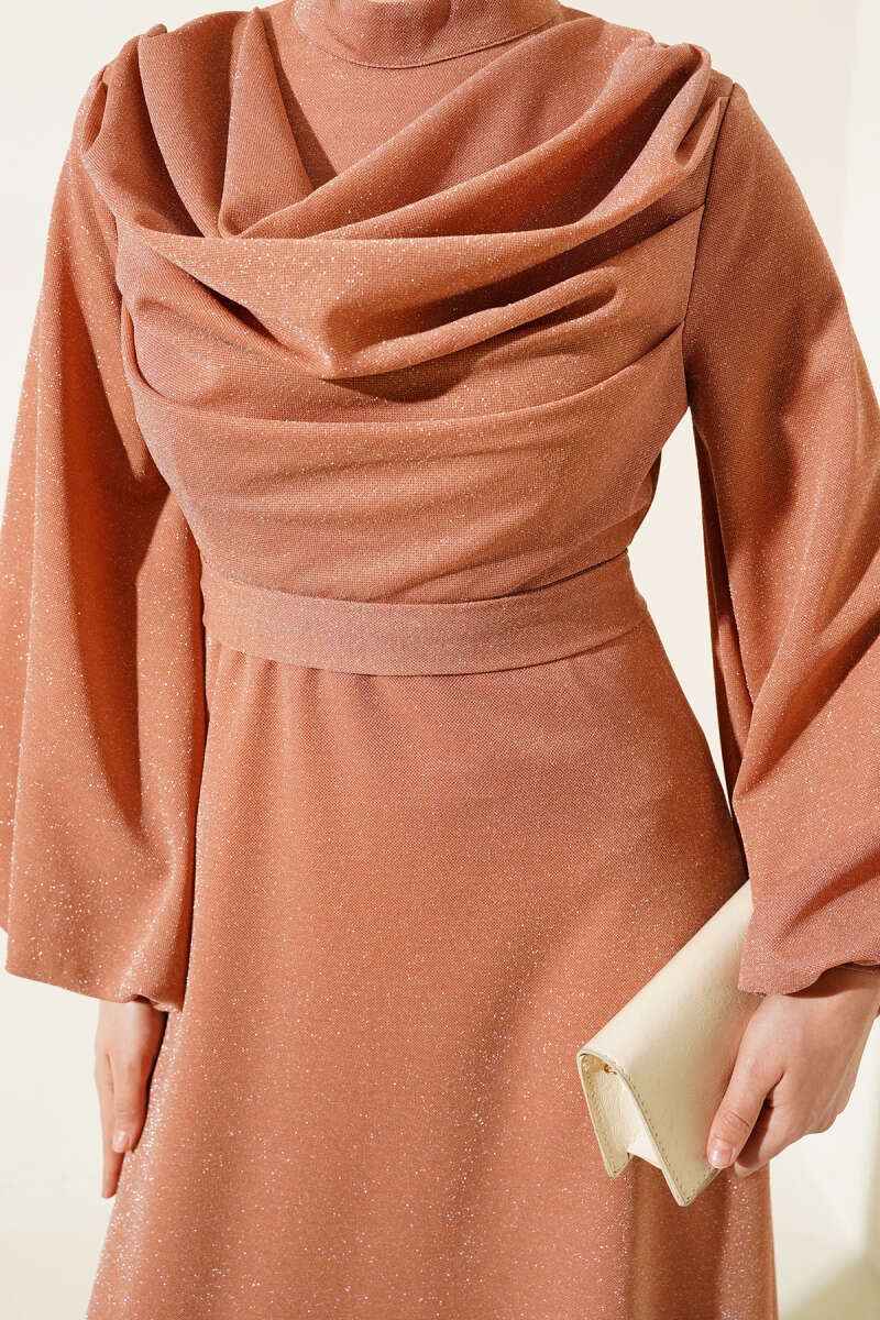 Kol Ucu Kürklü Fitilli Kaşe Elbise Kahve