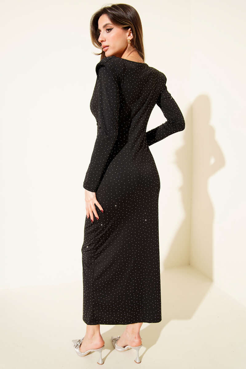 Degaje Yaka Taşlı Vatkalı Elbise Kahve