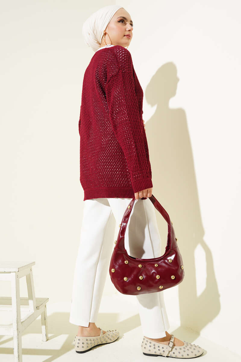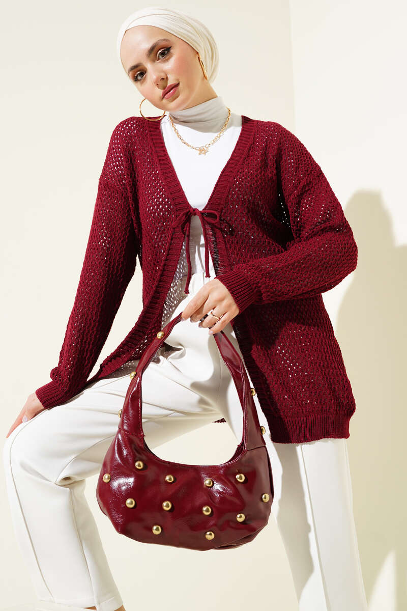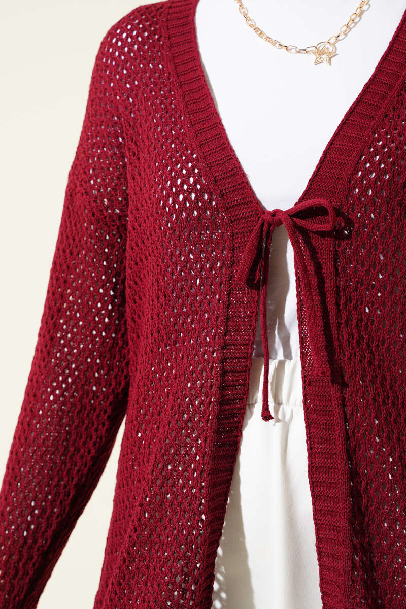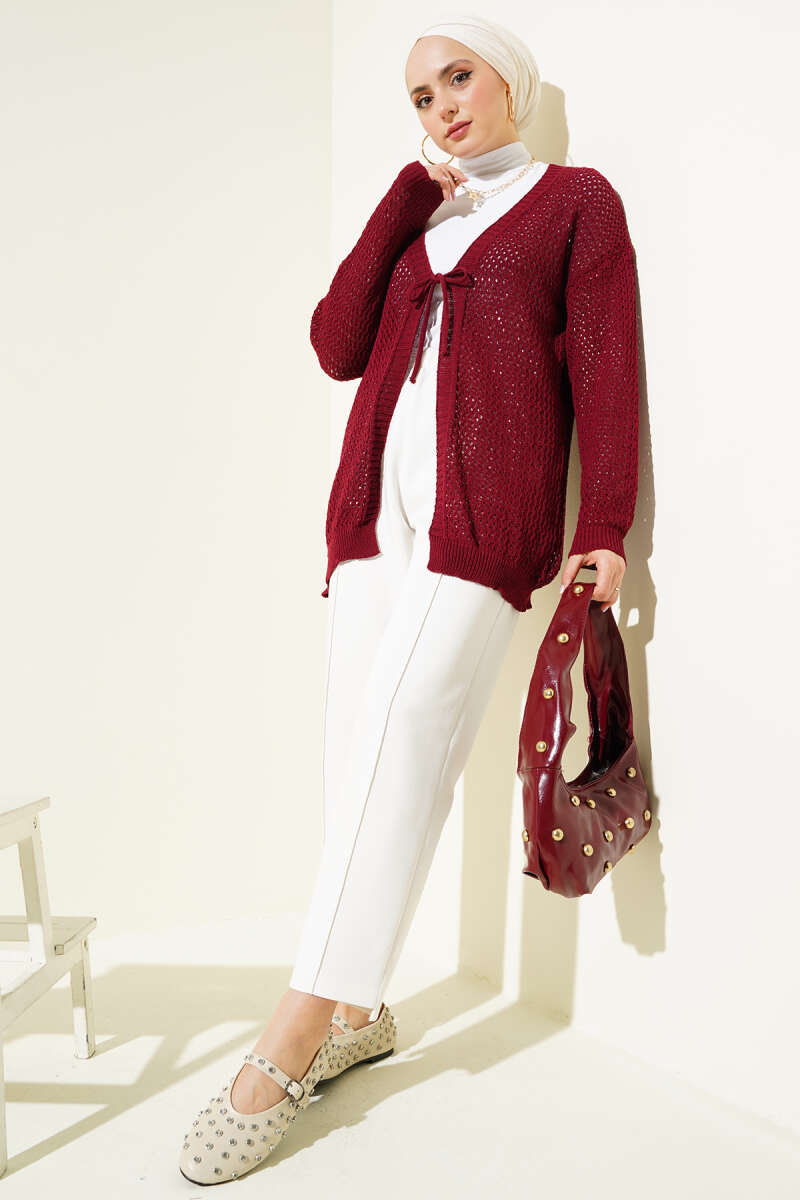 Delikli İp Bağcıklı Triko Hırka Bordo