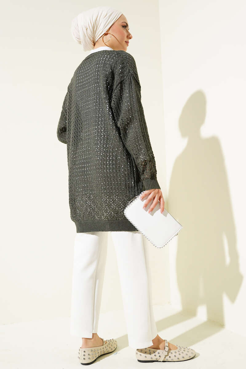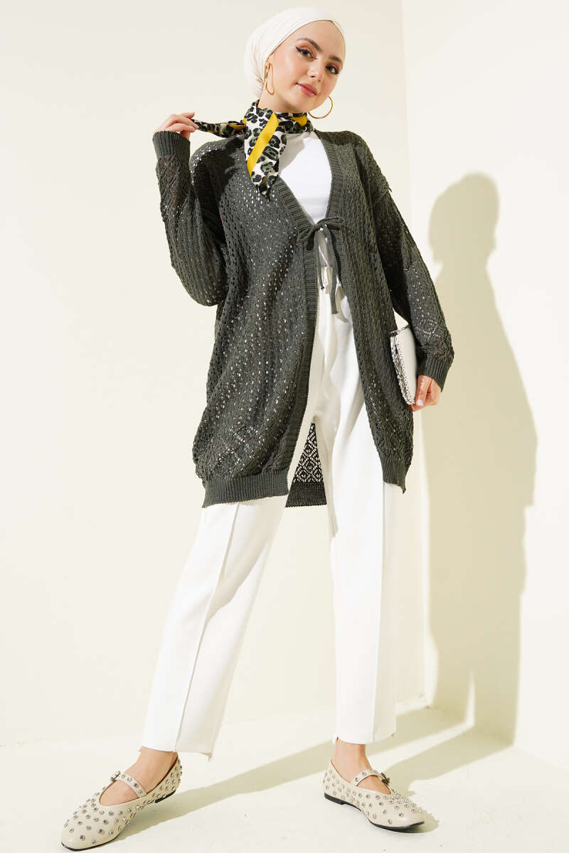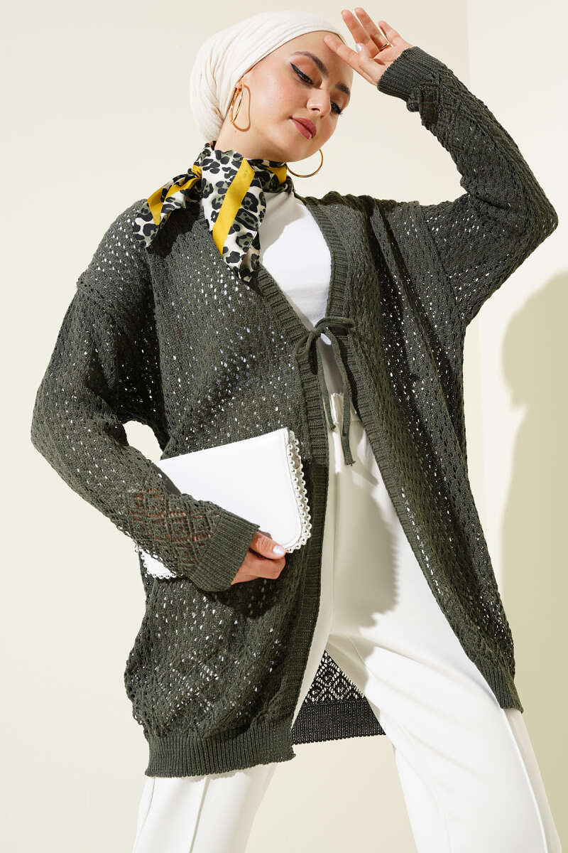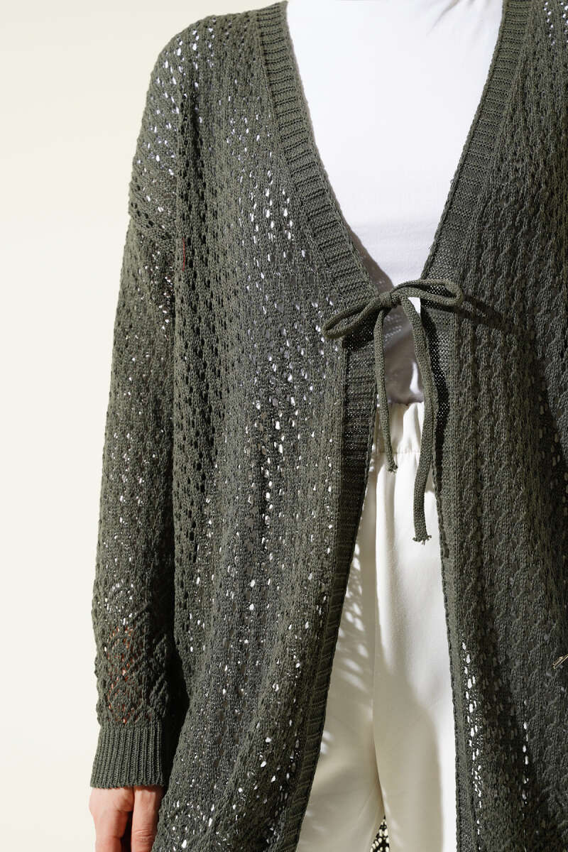 Delikli İp Bağcıklı Triko Hırka Haki