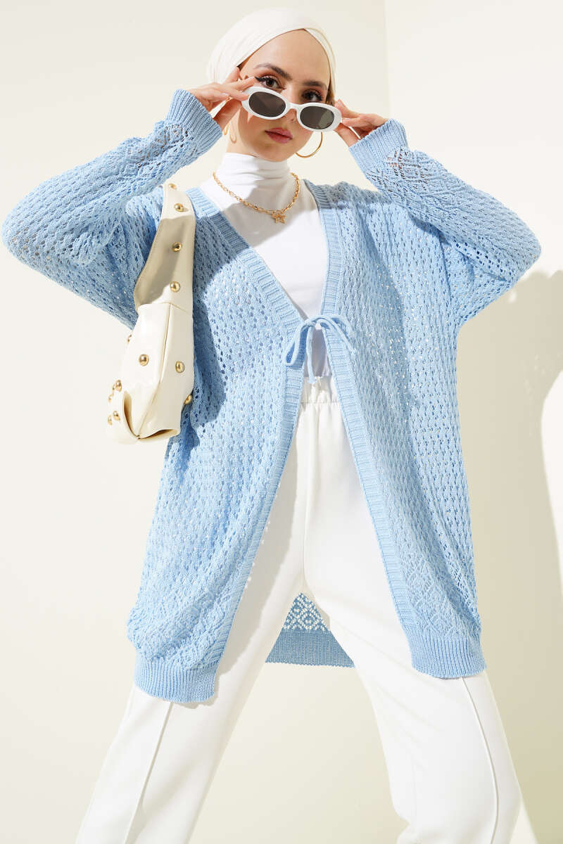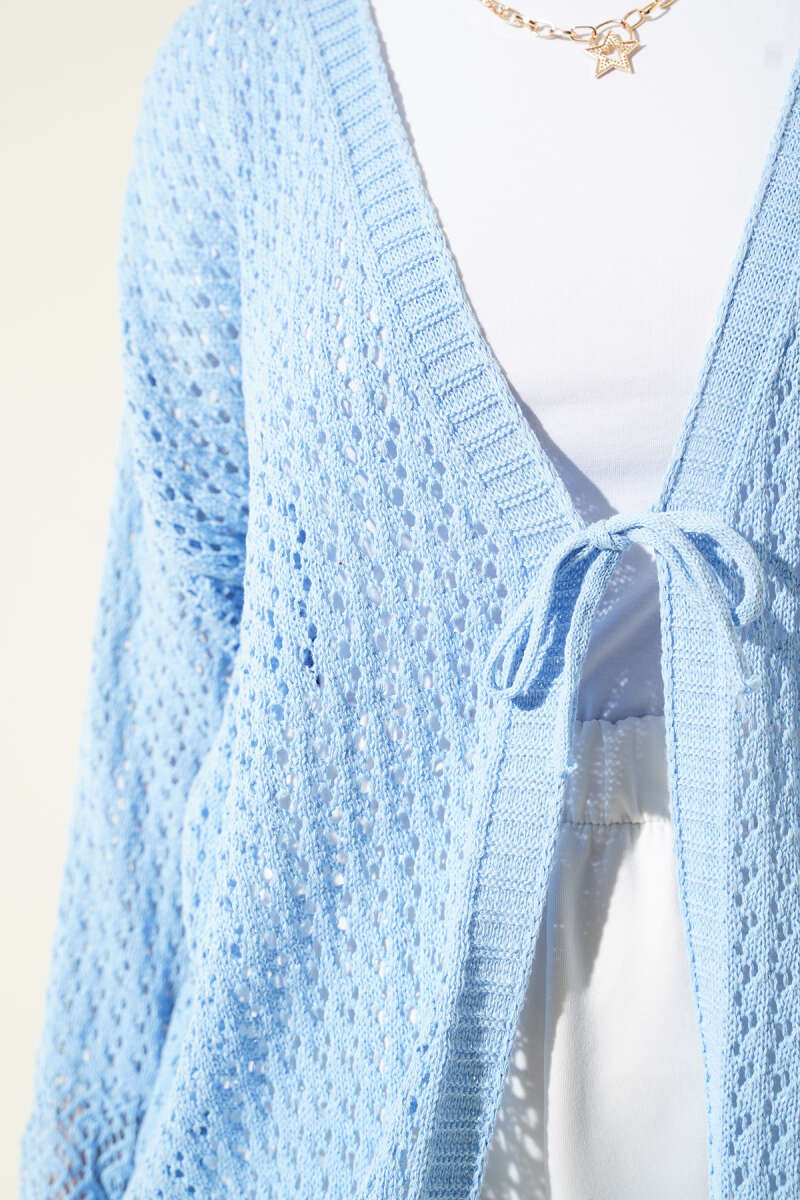 Delikli İp Bağcıklı Triko Hırka Mavi