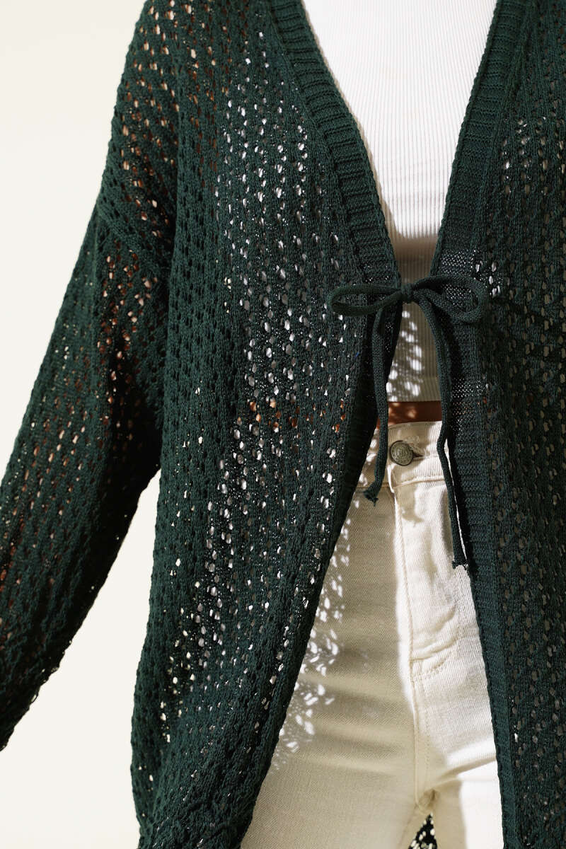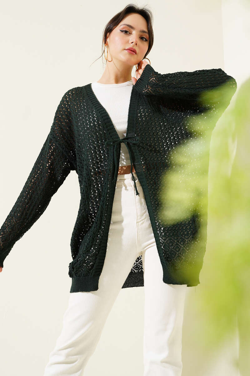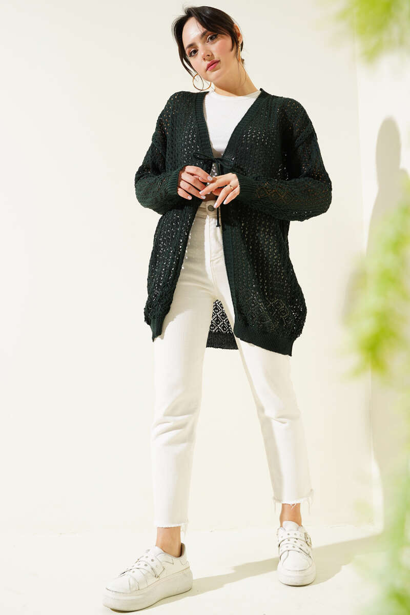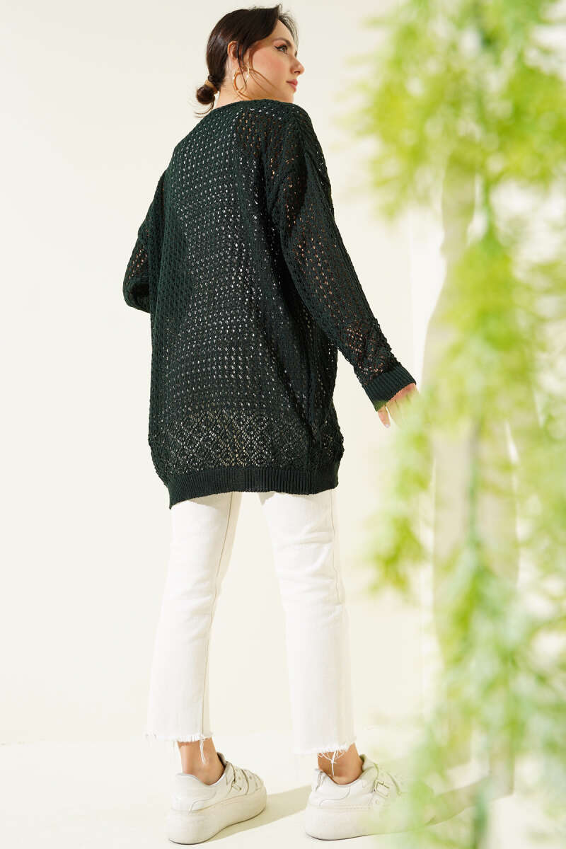 Saç Örgülü Düğmeli Triko Hırka Zümrüt