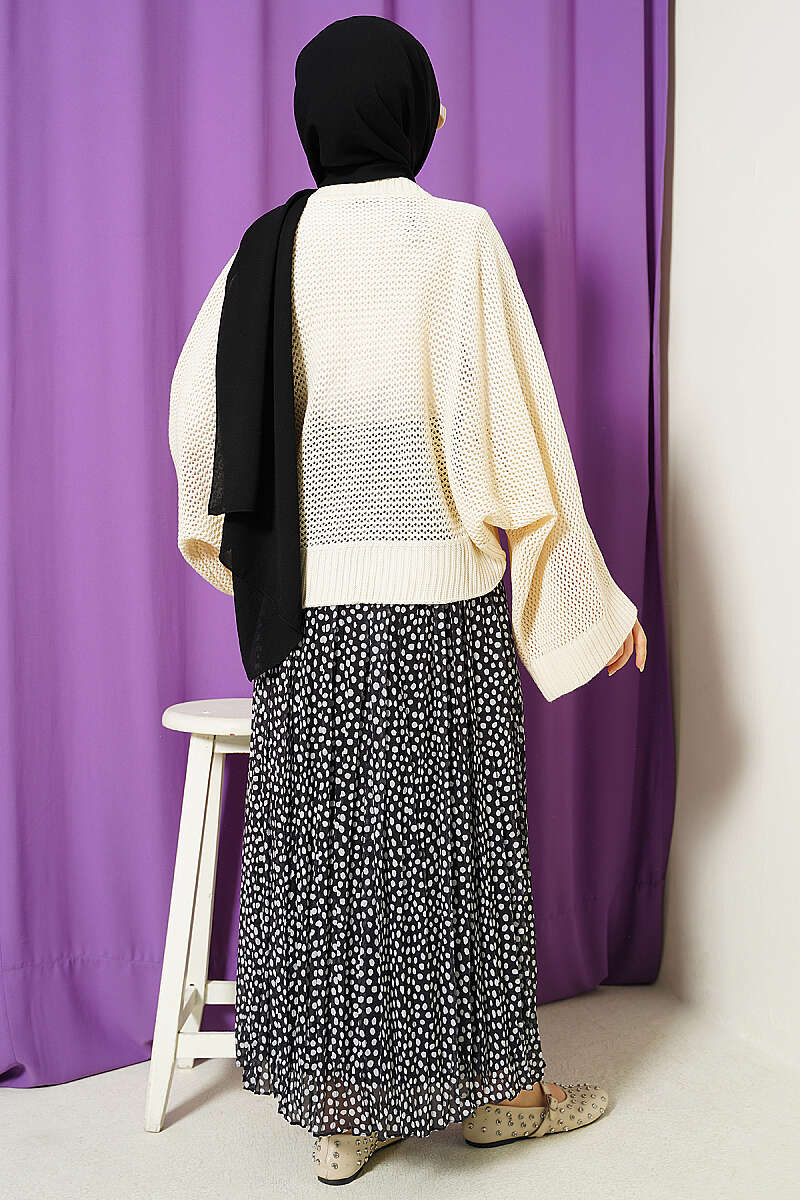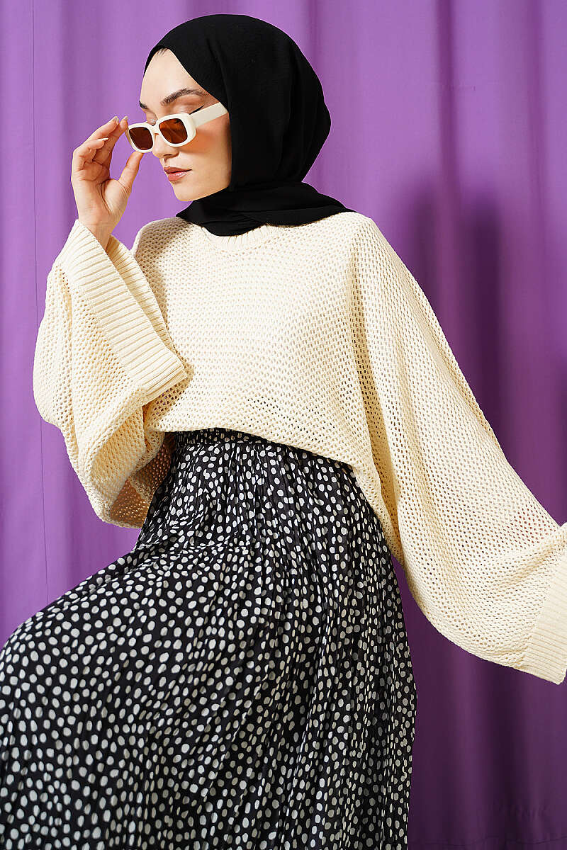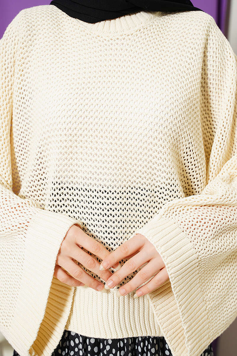 Delikli Yarasa Kol Triko Ajur Kazak Bej