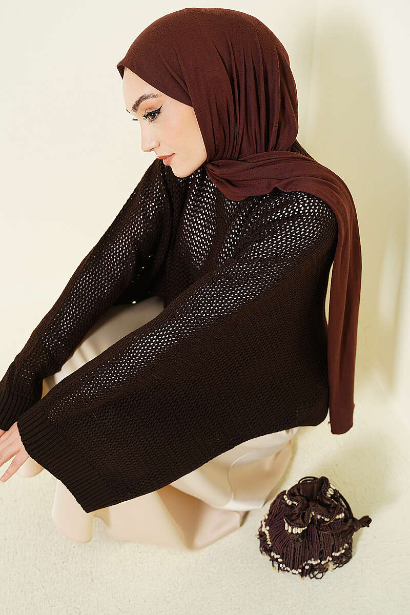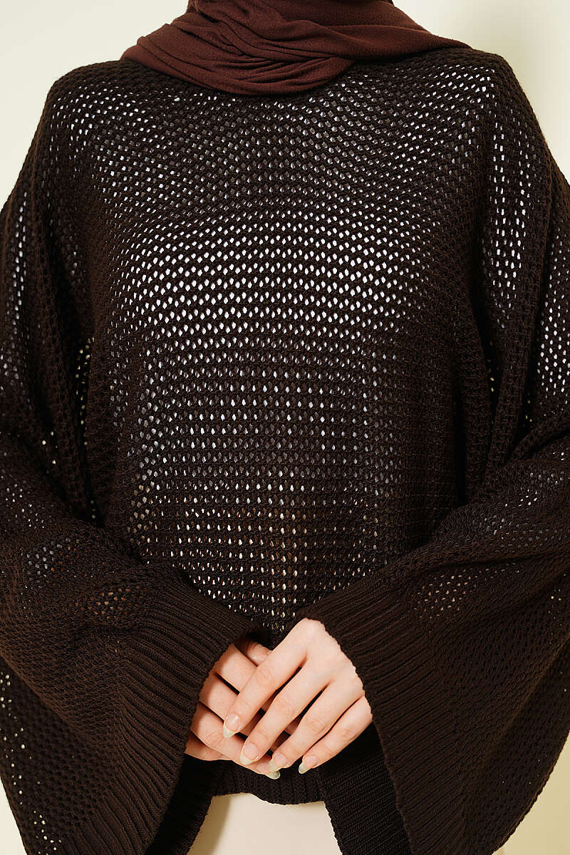 Delikli Yarasa Kol Triko Ajur Kazak Kahve