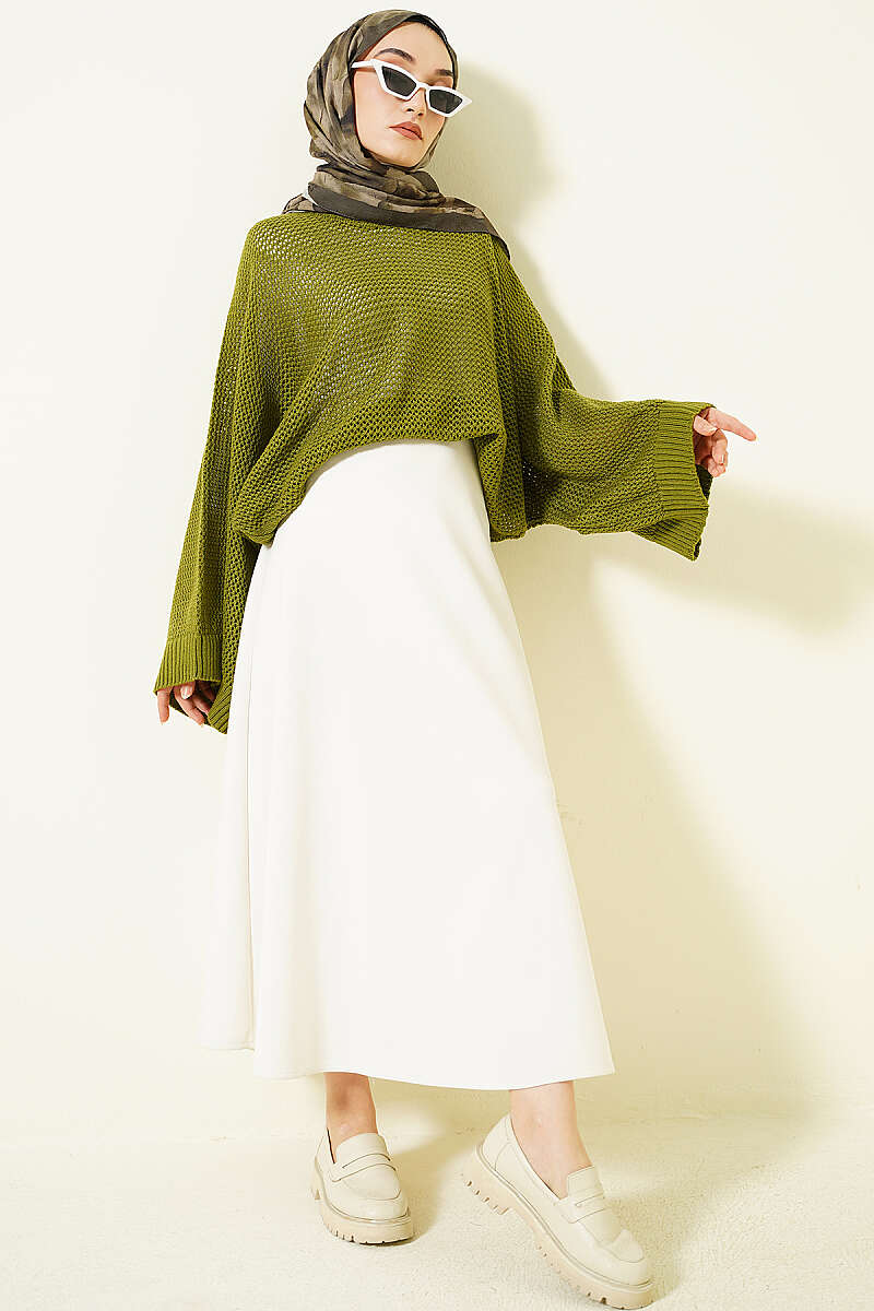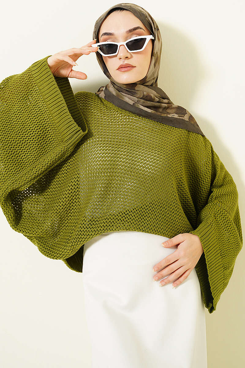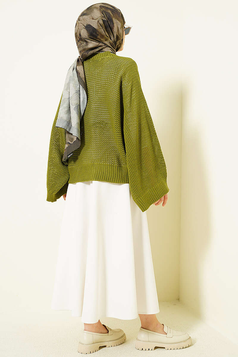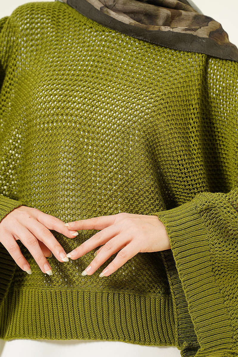 Delikli Yarasa Kol Triko Ajur Kazak Yeşil