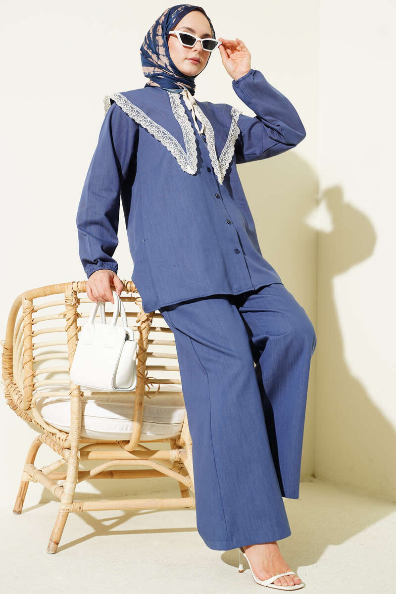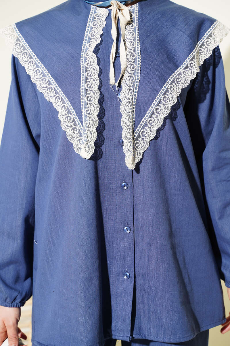 Denizci Yaka Dantelli Tunik İkili Takım Kahve