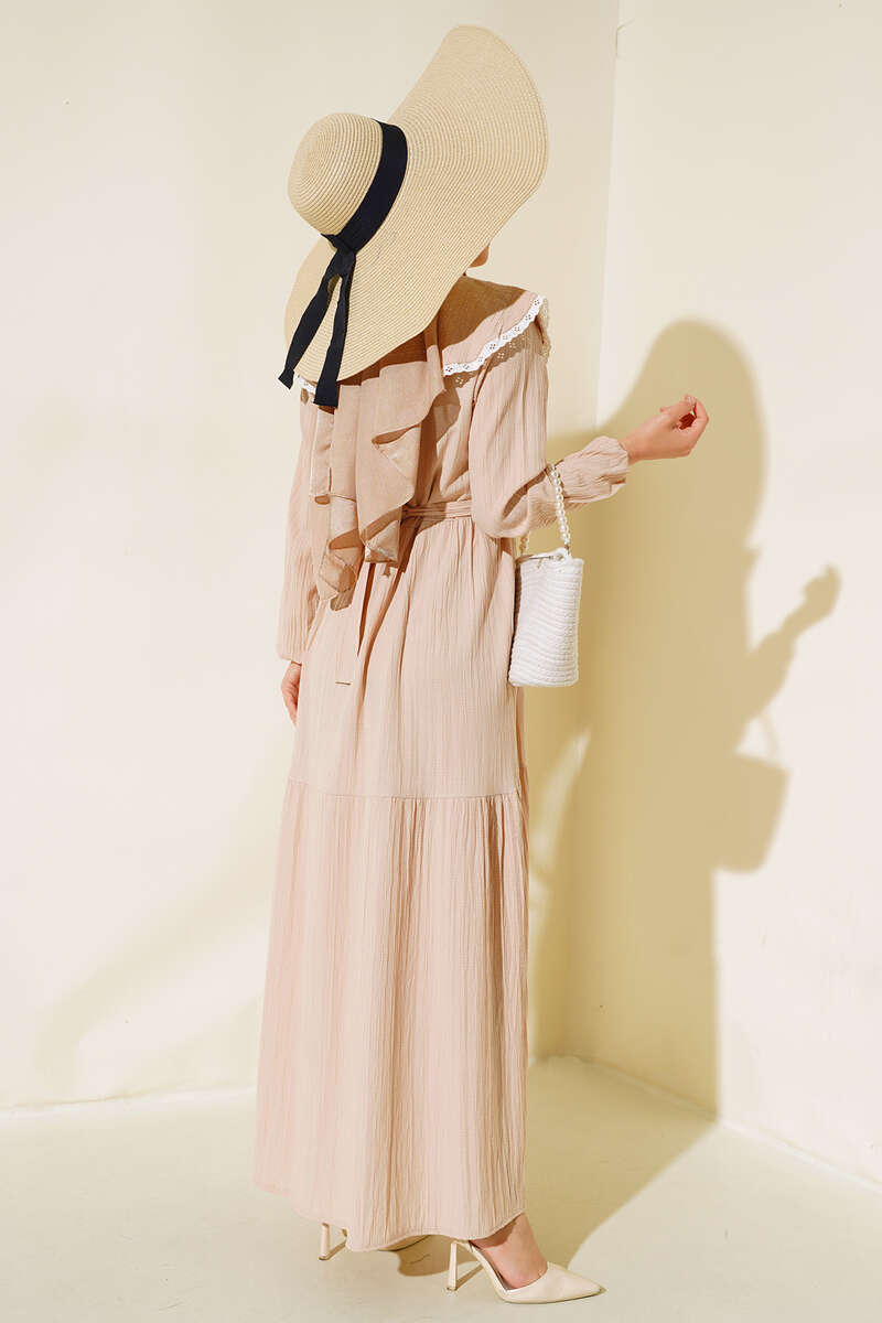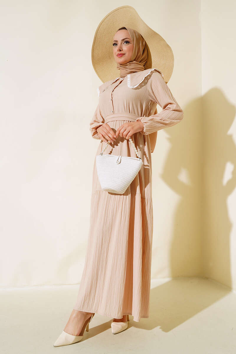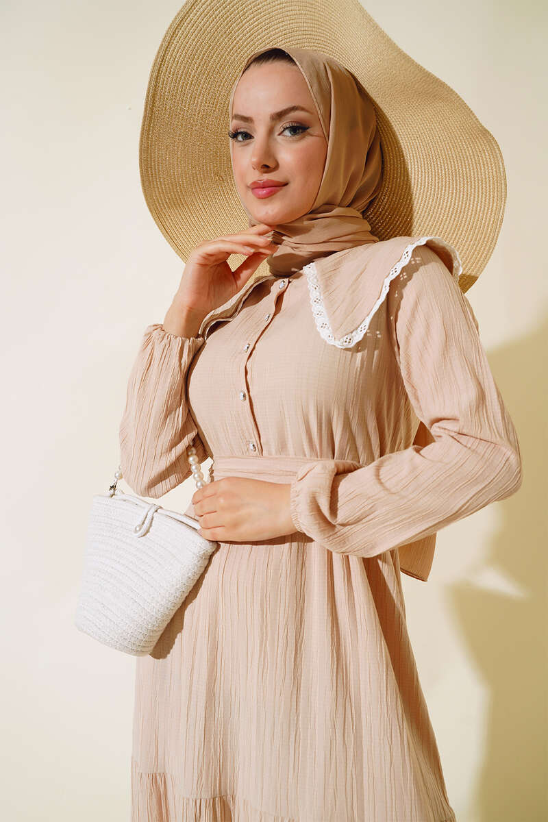 Yeni sezon elbise modelimiz sizlerle beraber. Elbisemiz denizci yaka modeldir. Yakası dantel detaylıdır. Önü yarım düğmelidir. Kol bilekleri lastiklidir. Kol modeldir. Elbisemizin iki adet kemer köprüsü olup, kendi kumaşından kuşağı vardır. Kat modeldir. Astarsızdır. Hm şık hem zarif elbisemiz renk seçenekleriyle sizleri bekliyor.