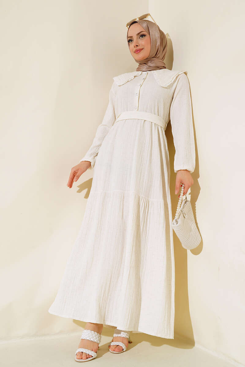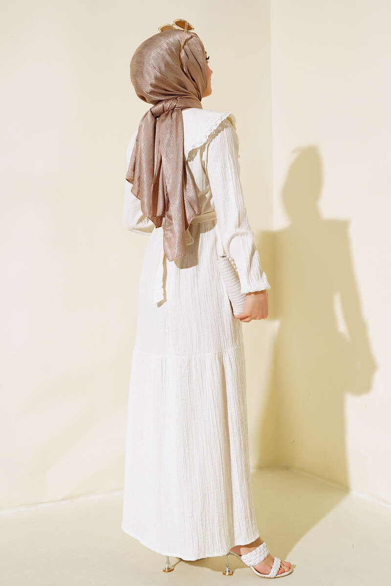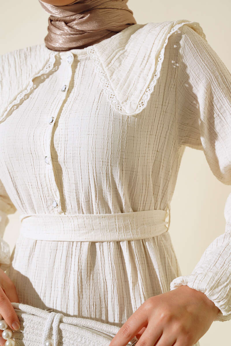 Scuba Pens Detaylı Kemerli Elbise Ekru