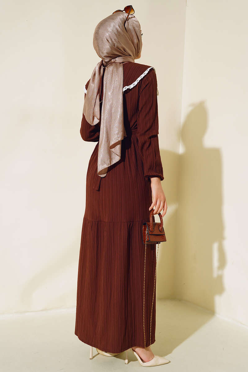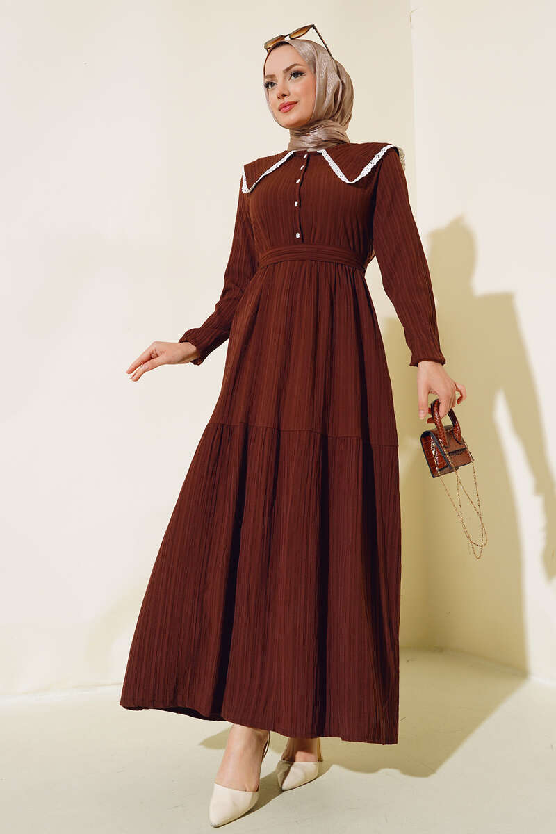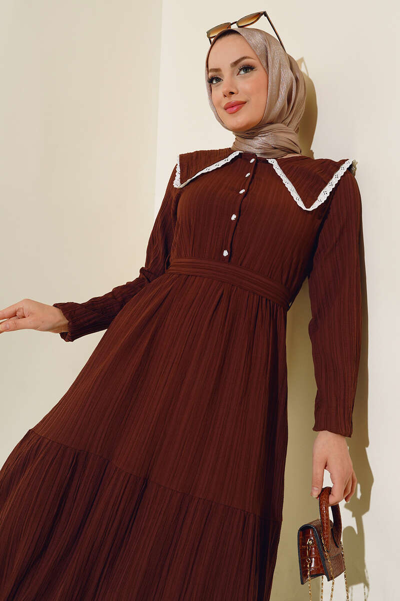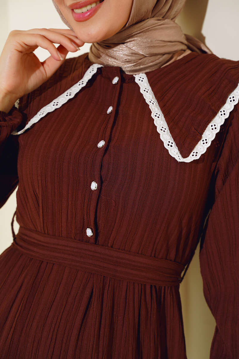 Yeni sezon elbise modelimiz sizlerle beraber. Elbisemiz denizci yaka modeldir. Yakası dantel detaylıdır. Önü yarım düğmelidir. Kol bilekleri lastiklidir. Kol modeldir. Elbisemizin iki adet kemer köprüsü olup, kendi kumaşından kuşağı vardır. Kat modeldir. Astarsızdır. Hm şık hem zarif elbisemiz renk seçenekleriyle sizleri bekliyor.