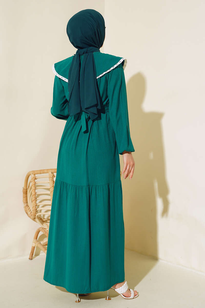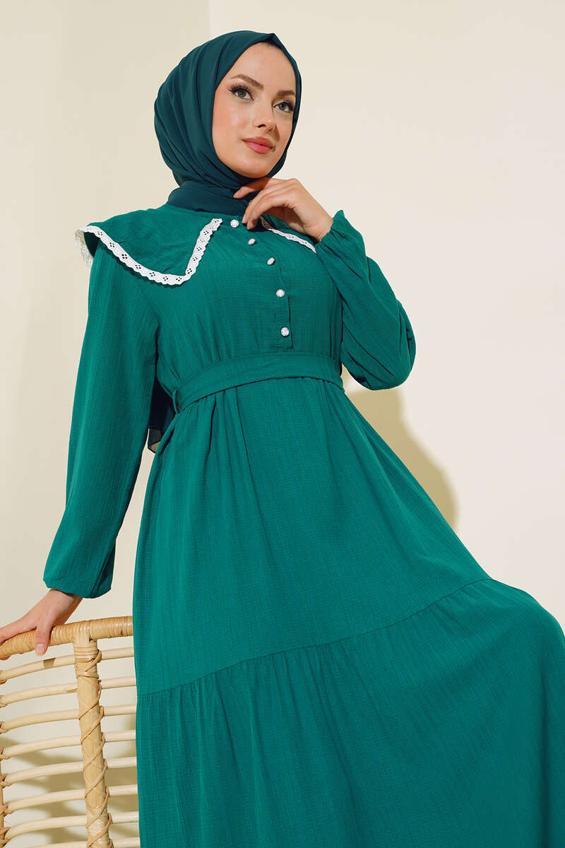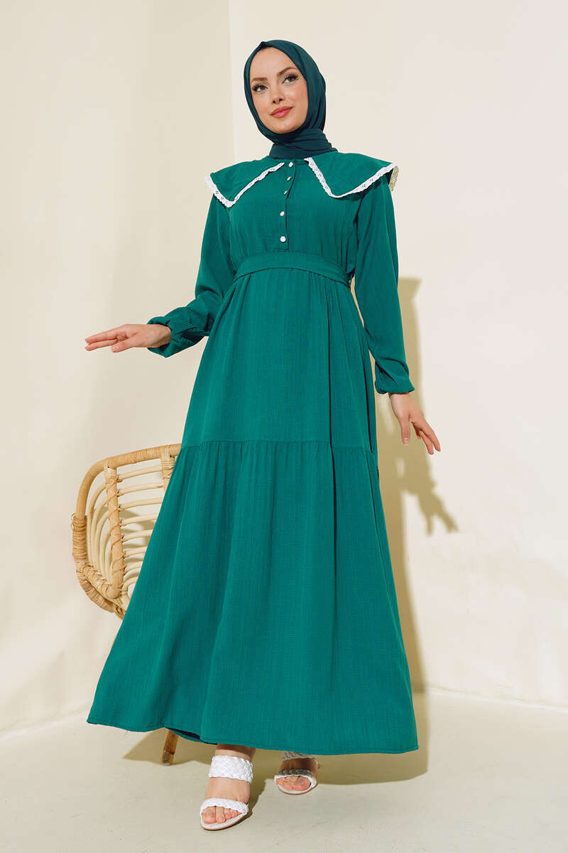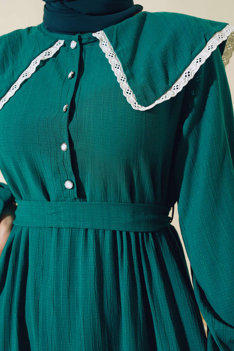 Yeni sezon elbise modelimiz sizlerle beraber. Elbisemiz denizci yaka modeldir. Yakası dantel detaylıdır. Önü yarım düğmelidir. Kol bilekleri lastiklidir. Kol modeldir. Elbisemizin iki adet kemer köprüsü olup, kendi kumaşından kuşağı vardır. Kat modeldir. Astarsızdır. Hm şık hem zarif elbisemiz renk seçenekleriyle sizleri bekliyor.