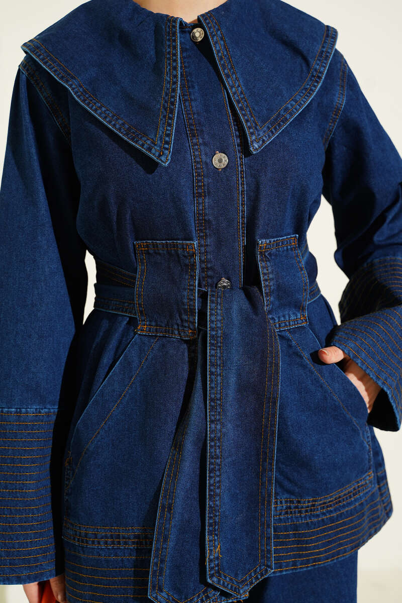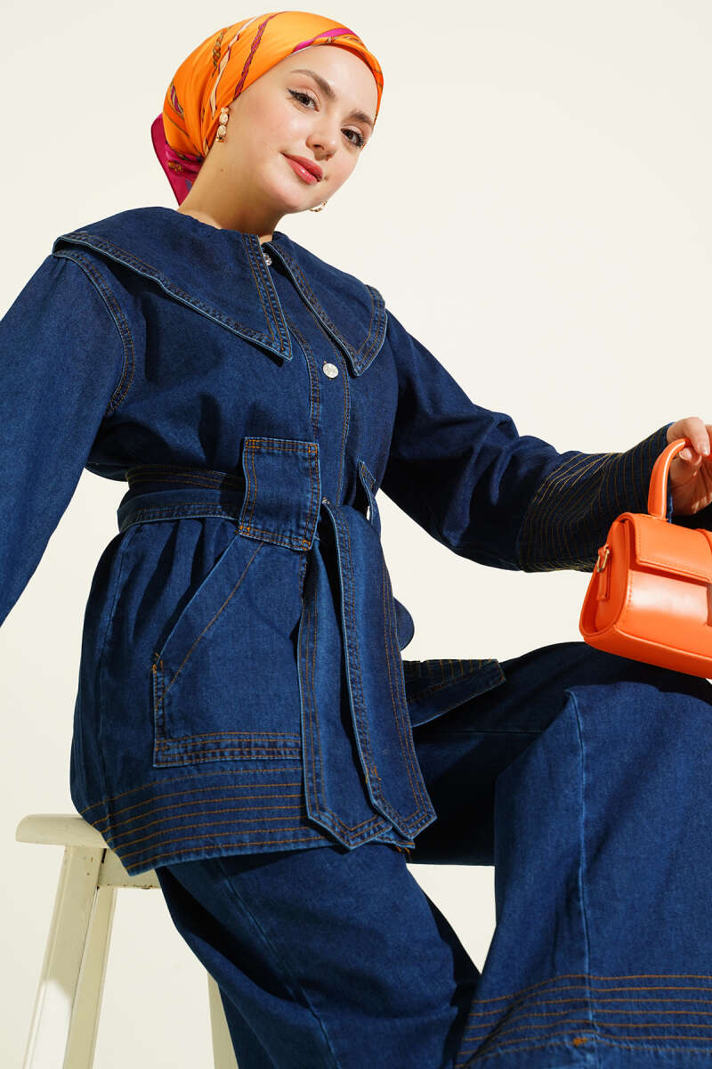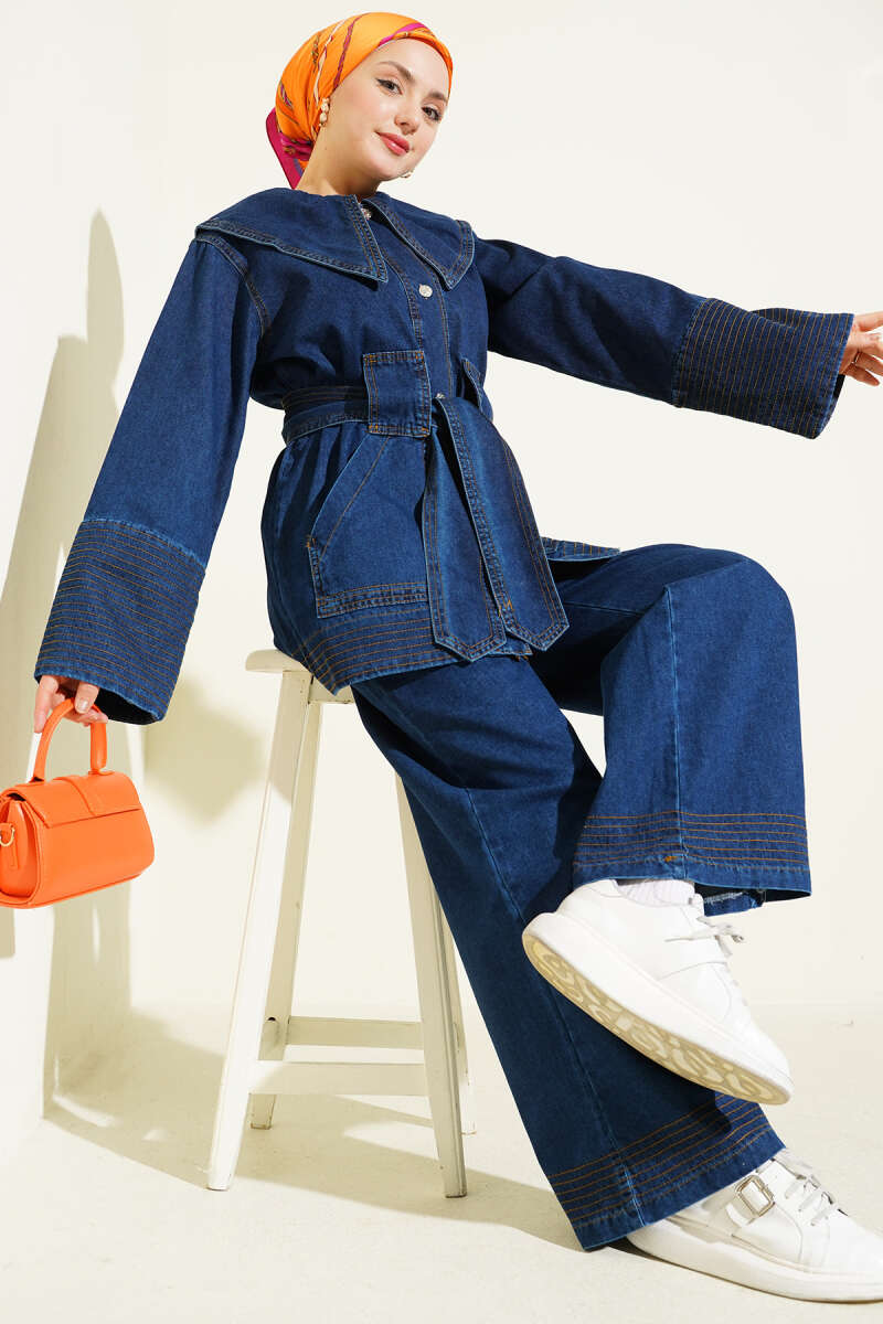 Denizci Yaka Kuşaklı Kot İkili Takım Mavi
