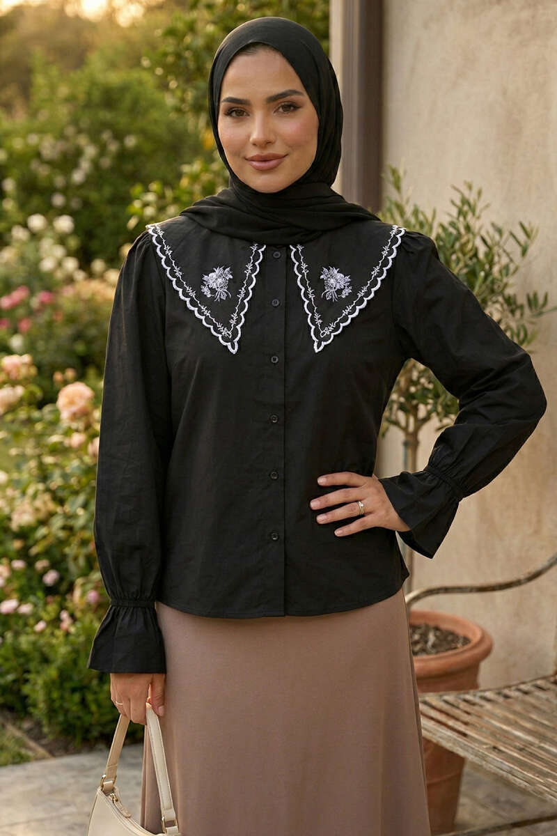 Denizci Yaka Nakışlı Gömlek Siyah