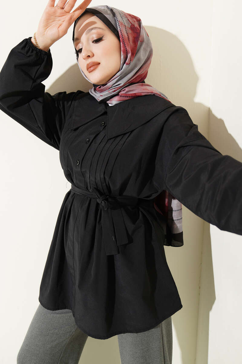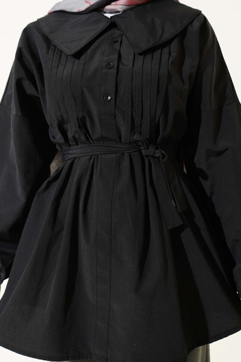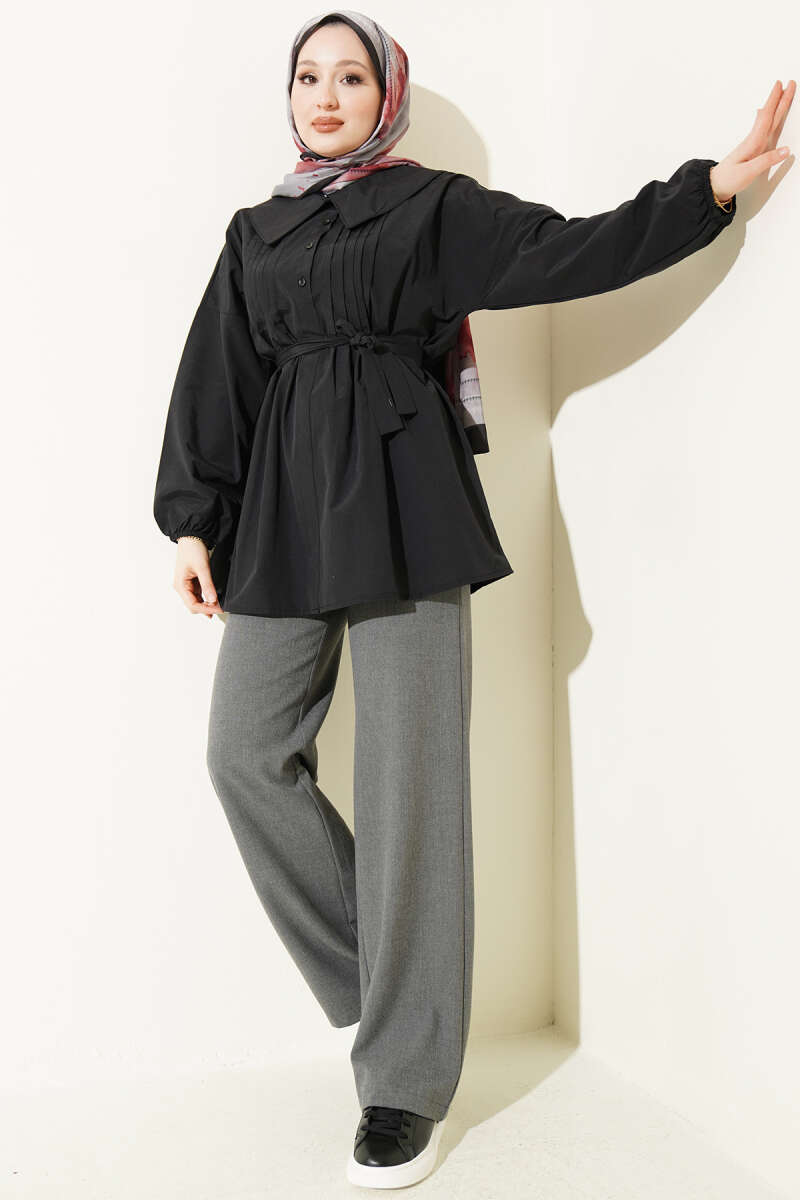Kat Kat Detaylı Büzgülü Gömlek Siyah