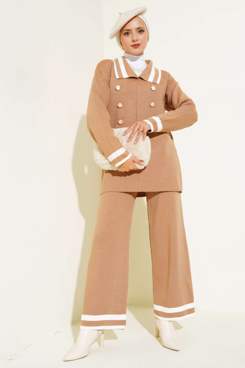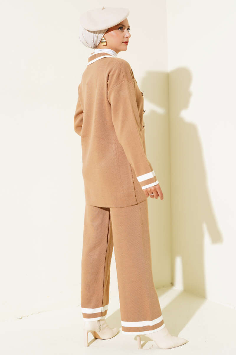 Dikiş Detaylı Basic Triko İkili Takım Bej