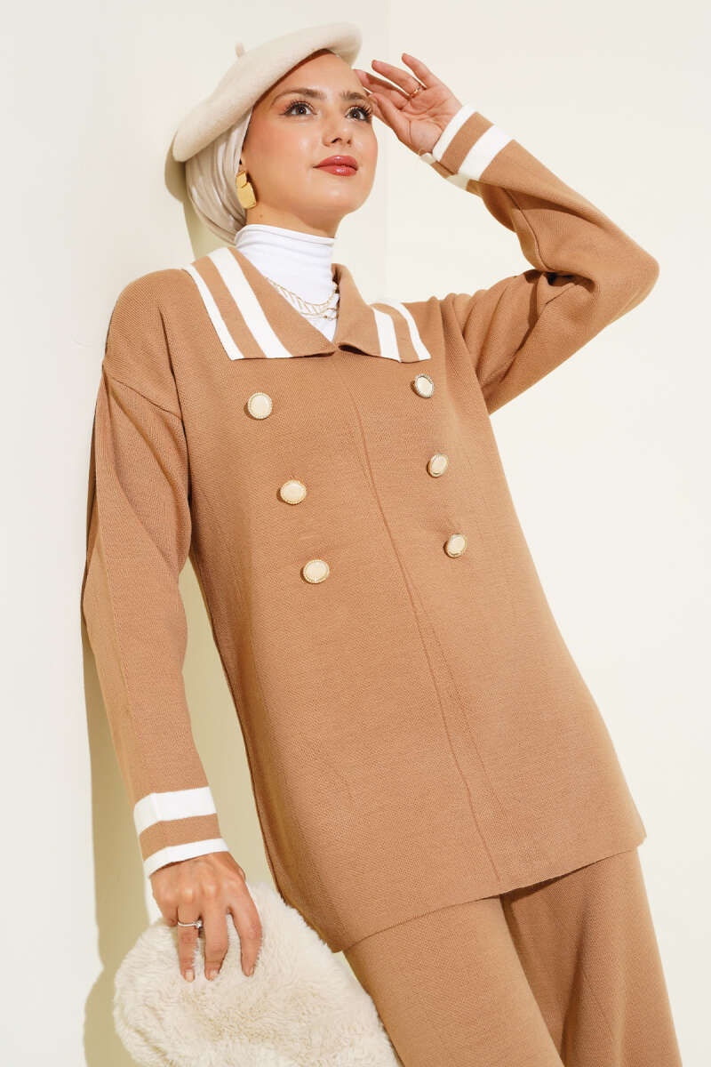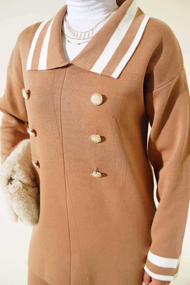 Balon Kol Balıkçı Yaka Triko İkili Takım Kahve