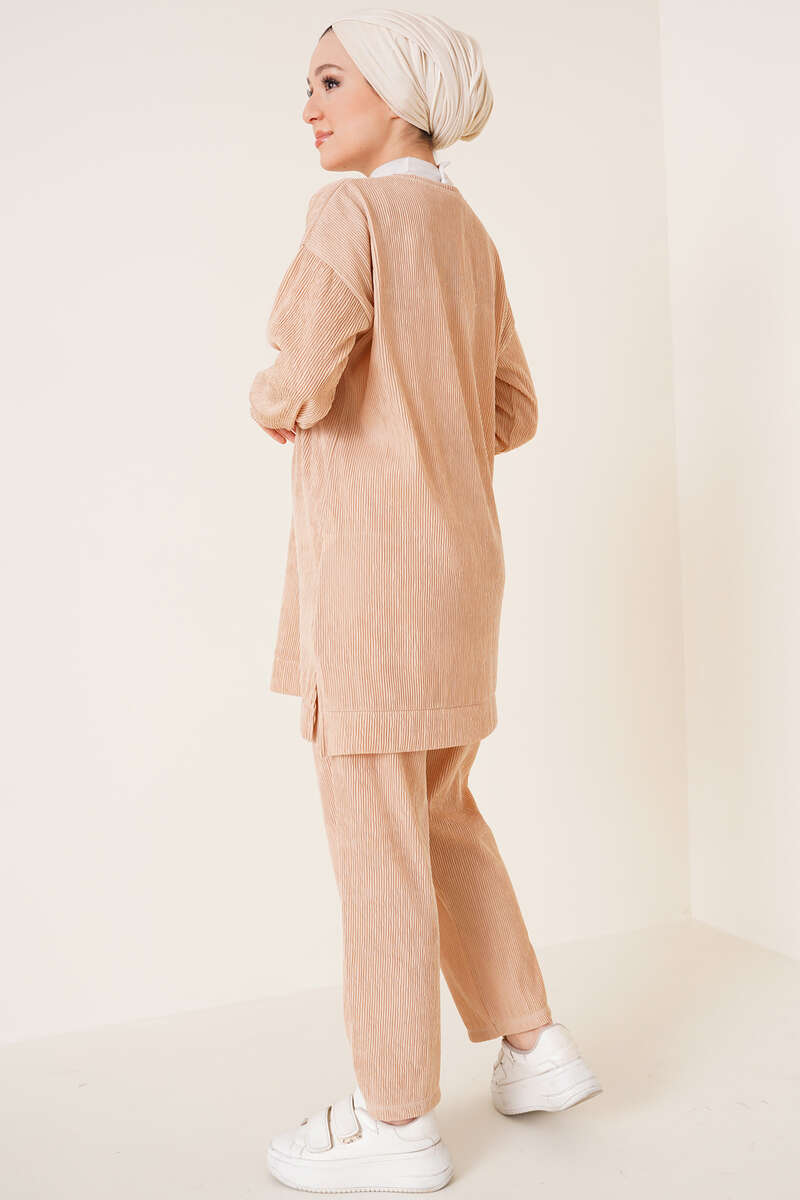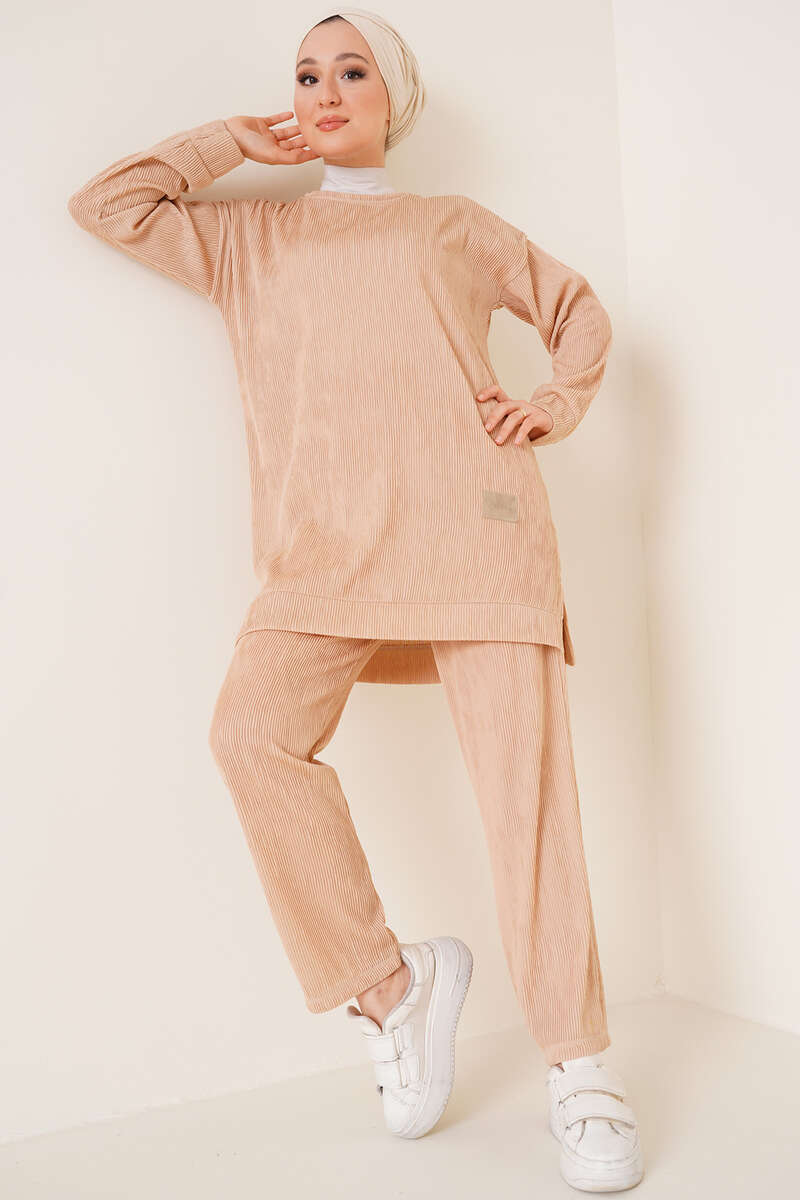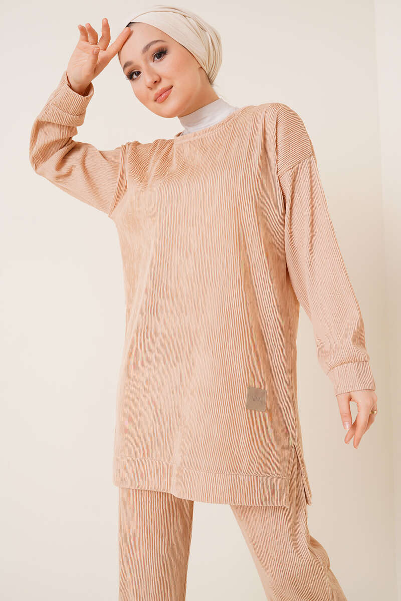 Yeni sezon ikili takımımız harika görünümüyle sizler için geldi. Tuniğimizin önünde deri arma bulunmaktadır. Yanları yırtmaçlıdır. Uzun yapıdadır. Pantolon beli lastikli cepsiz modeldir. Takımımız sportiftir. Oldukça rahattır. Farklı renk seçenekleri mevcuttur.