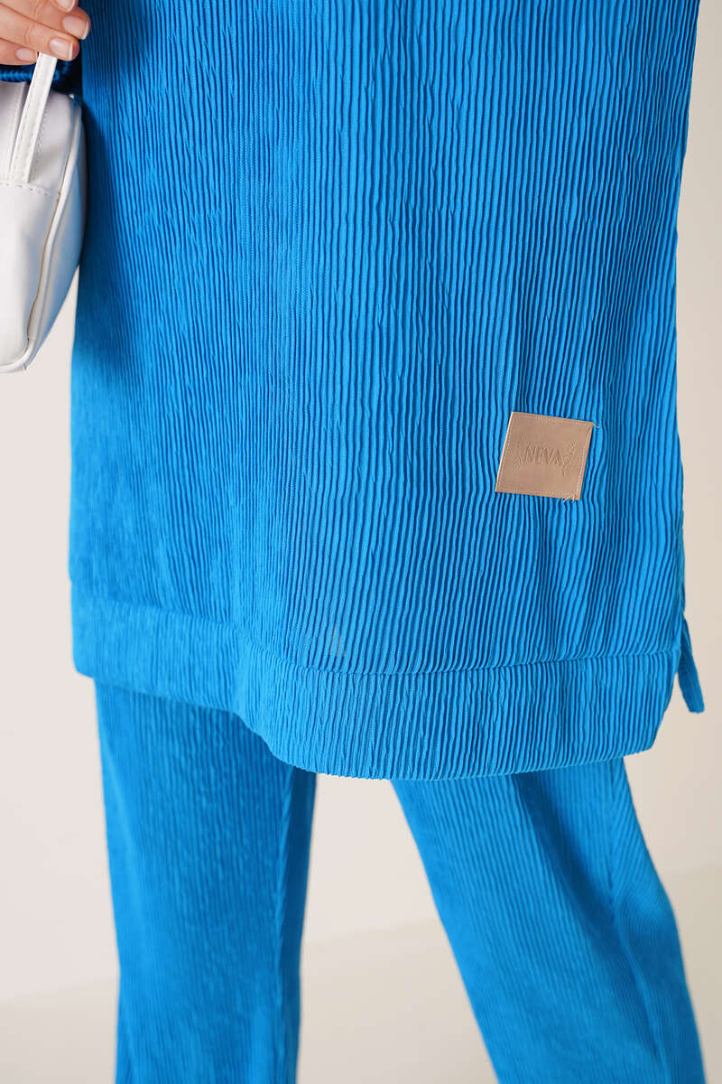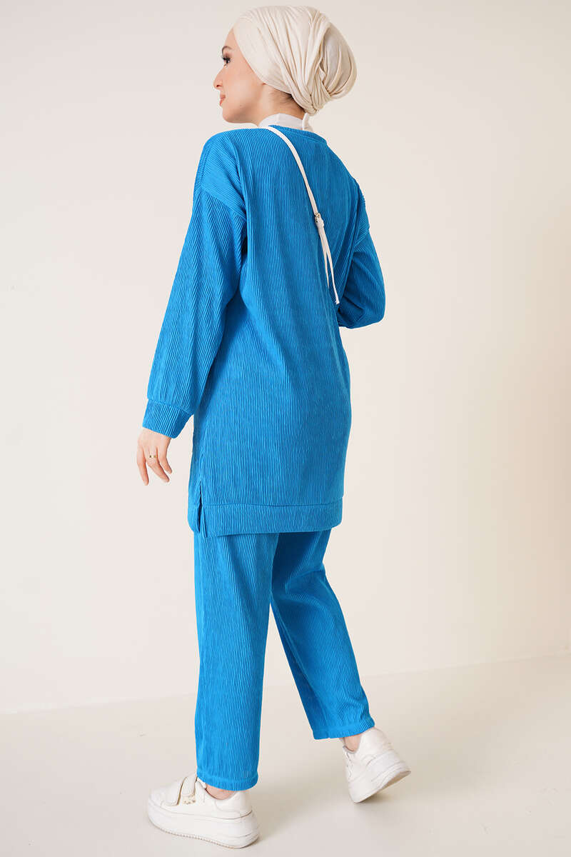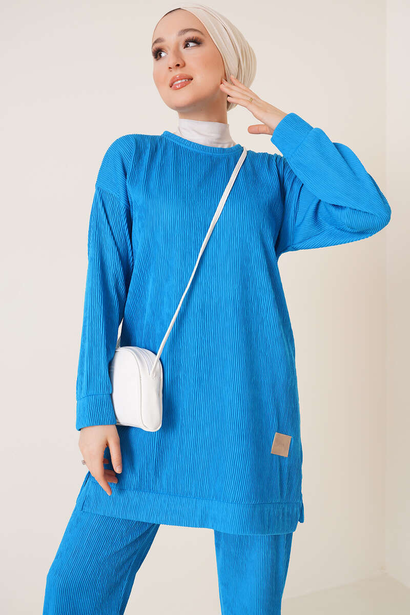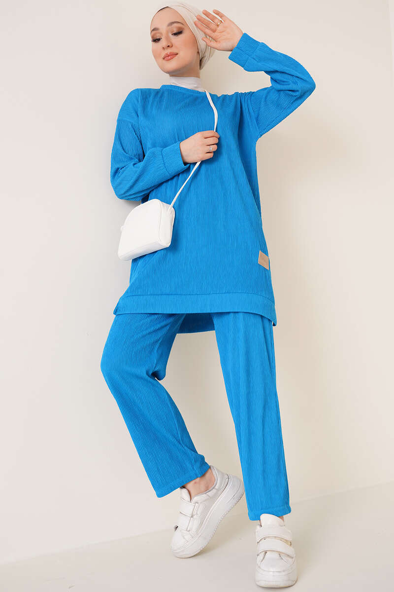 Yeni sezon ikili takımımız harika görünümüyle sizler için geldi. Tuniğimizin önünde deri arma bulunmaktadır. Yanları yırtmaçlıdır. Uzun yapıdadır. Pantolon beli lastikli cepsiz modeldir. Takımımız sportiftir. Oldukça rahattır. Farklı renk seçenekleri mevcuttur.