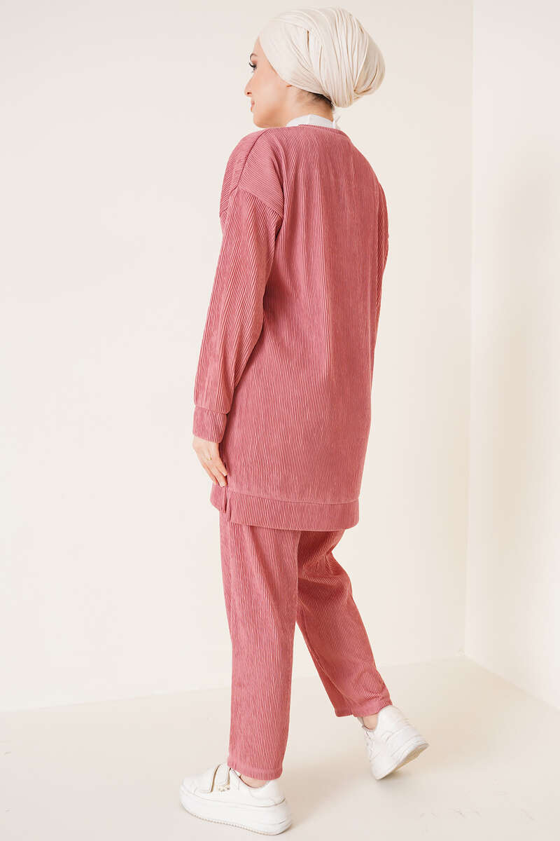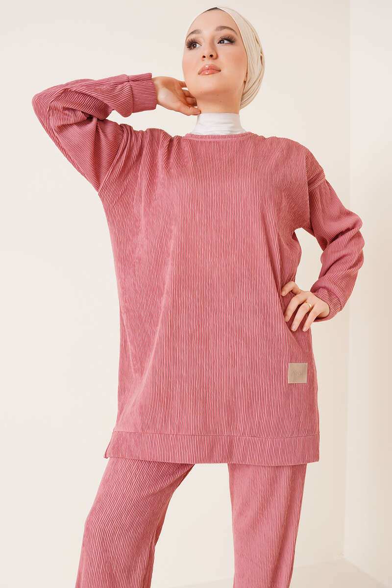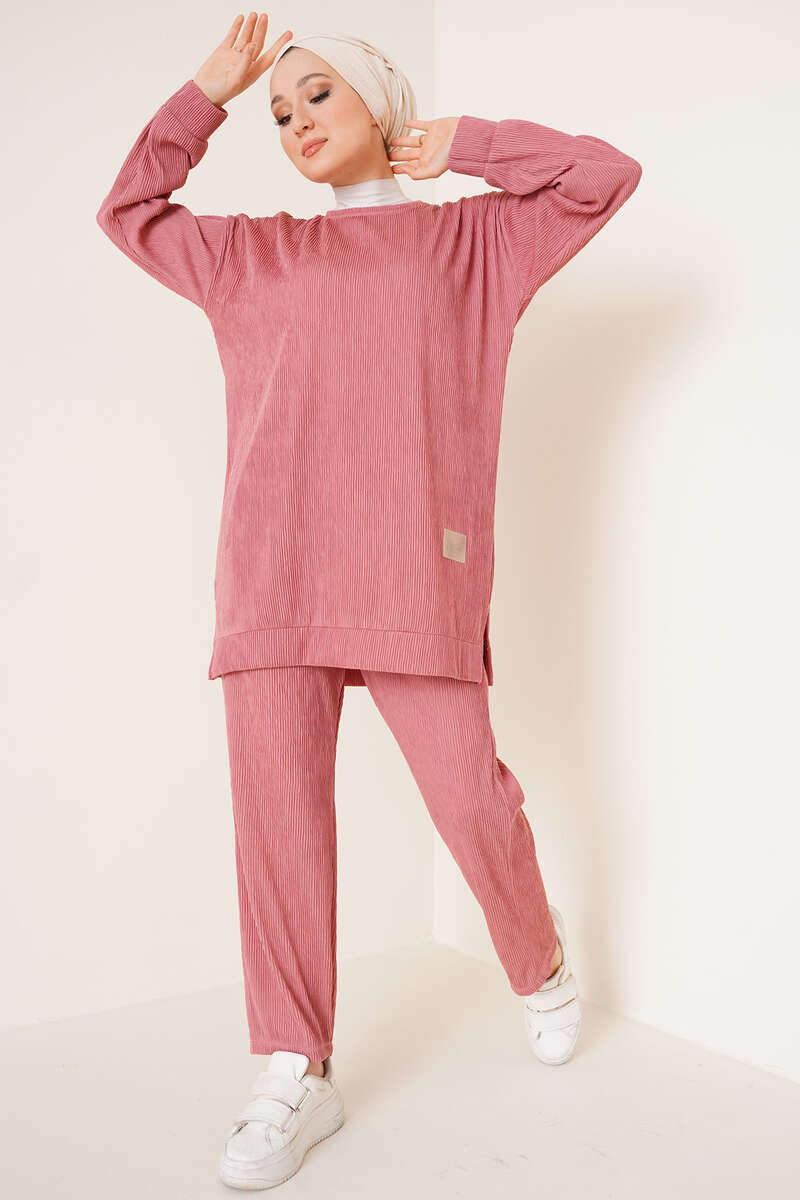 Yeni sezon ikili takımımız harika görünümüyle sizler için geldi. Tuniğimizin önünde deri arma bulunmaktadır. Yanları yırtmaçlıdır. Uzun yapıdadır. Pantolon beli lastikli cepsiz modeldir. Takımımız sportiftir. Oldukça rahattır. Farklı renk seçenekleri mevcuttur.