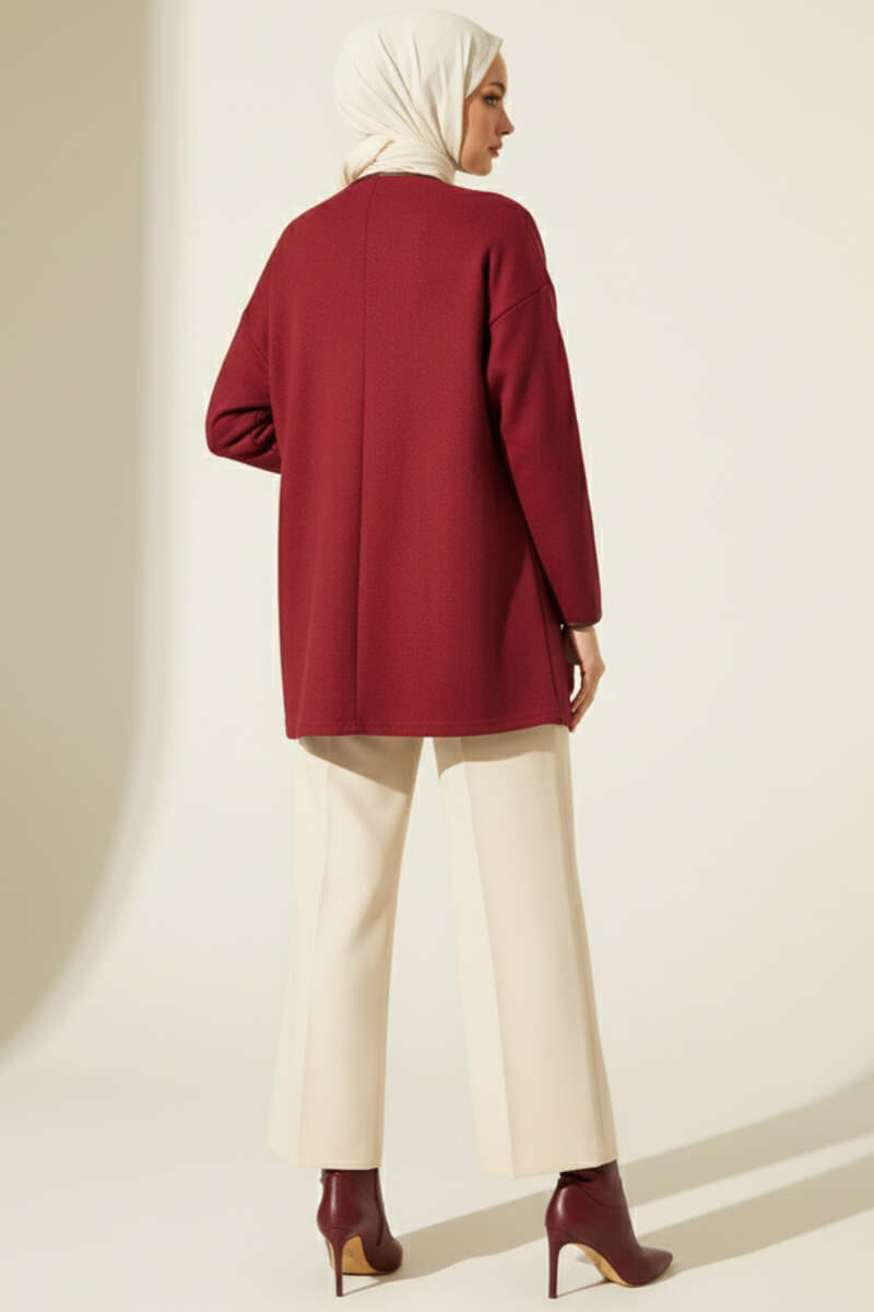 Yaka Düğmeli Kuşaklı Kaşe Kaban Bordo