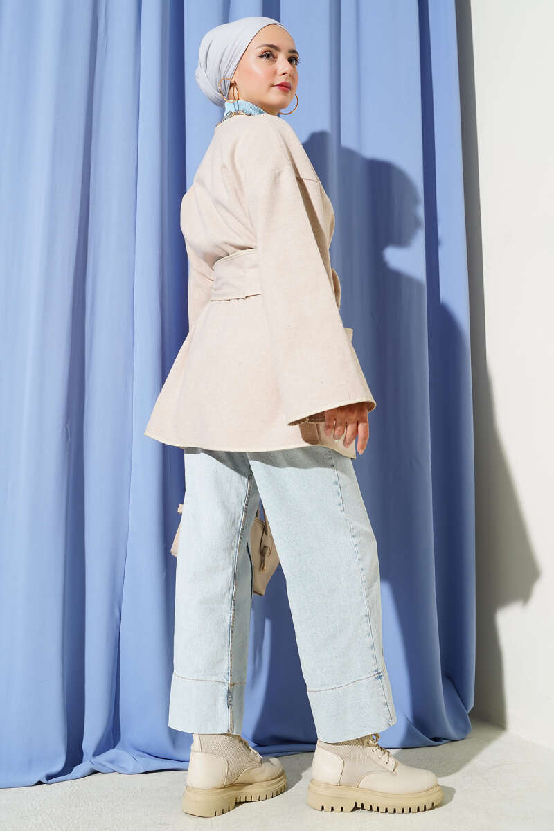Düğmeli Kuşak Detaylı Kaşe Kaban Siyah