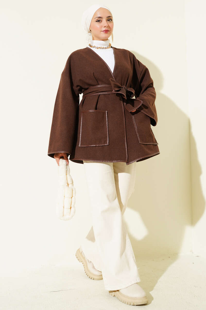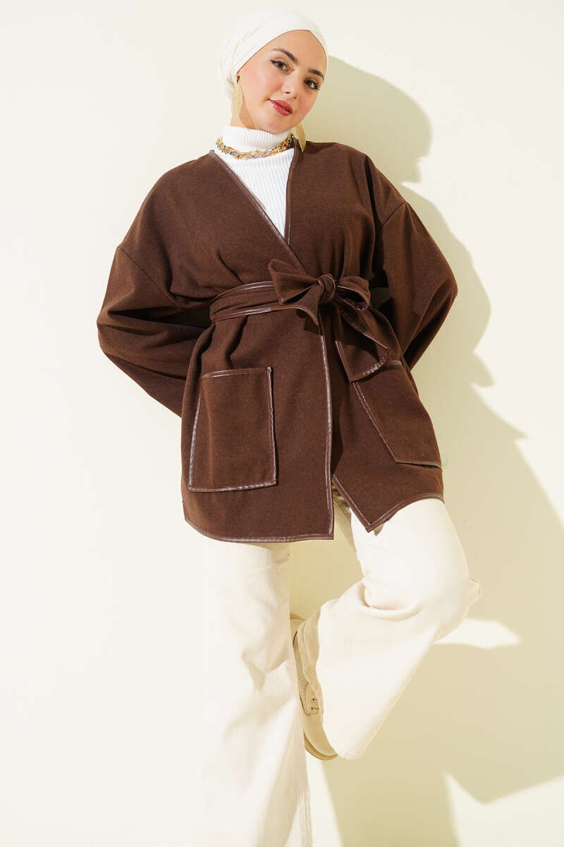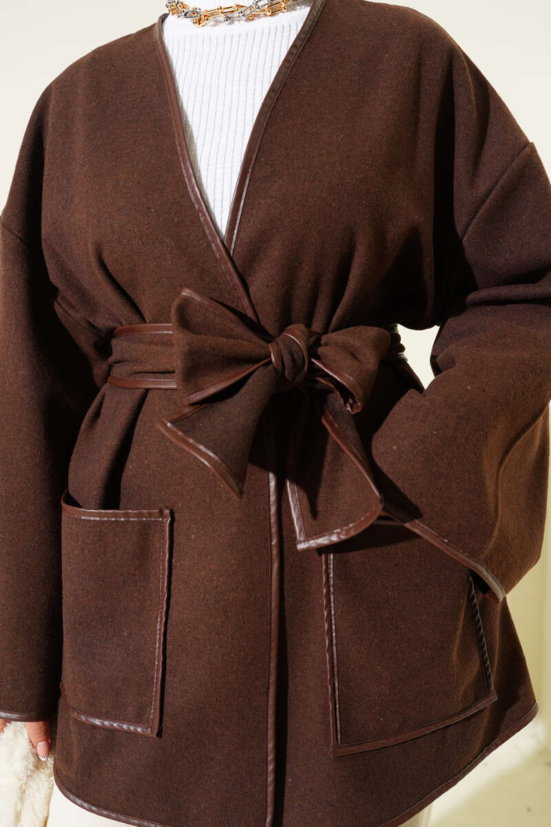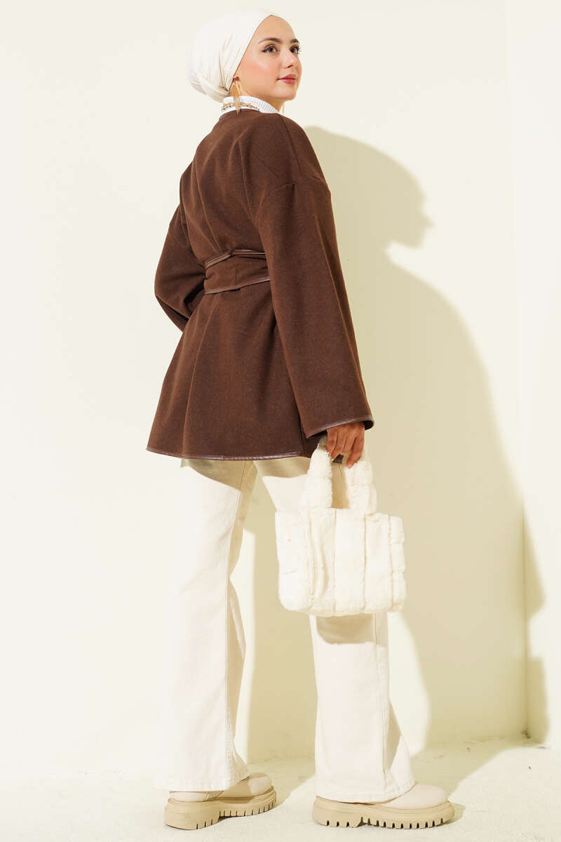 Leopar Desen Kemerli Tay Tüyü Ceket Kahve