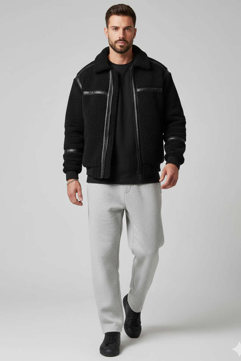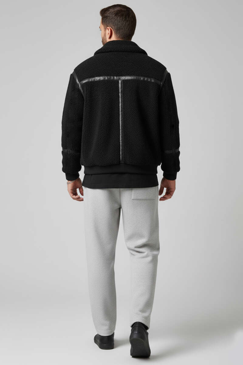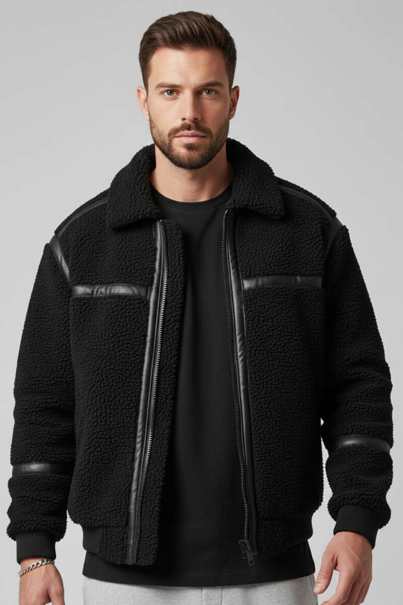 Penye Kapüşonlu Erkek Deri Mont Siyah