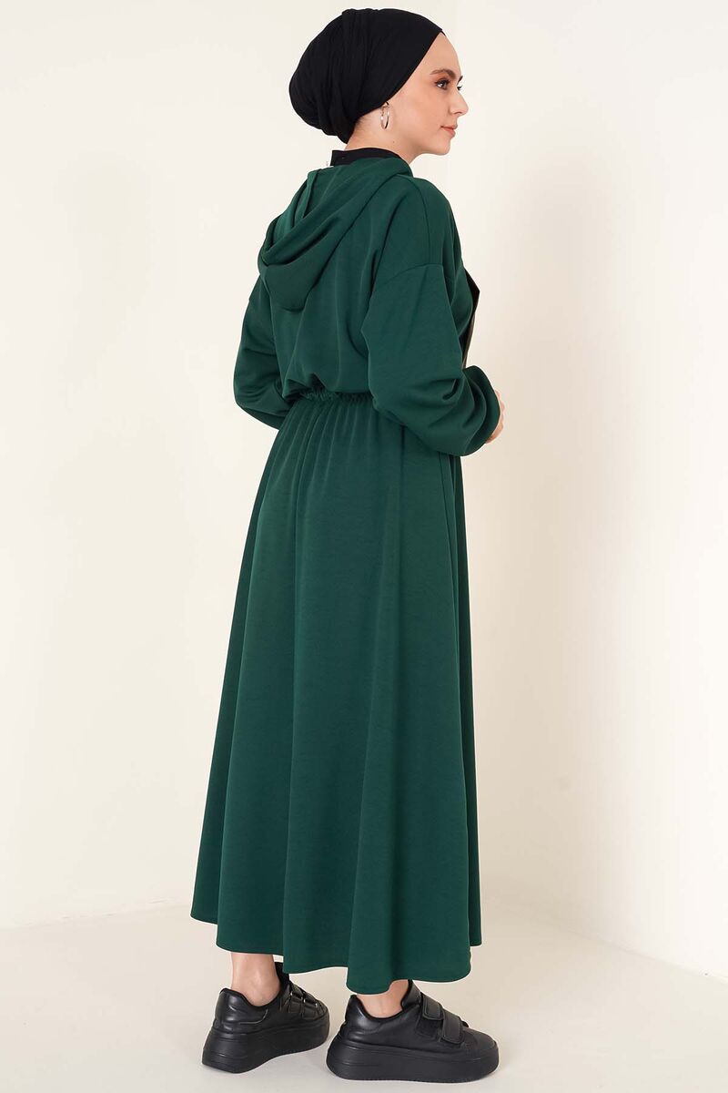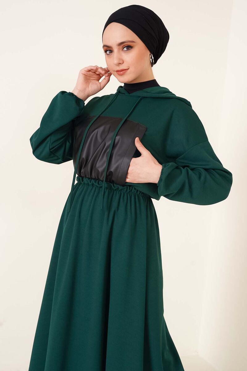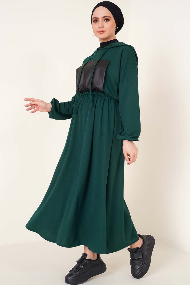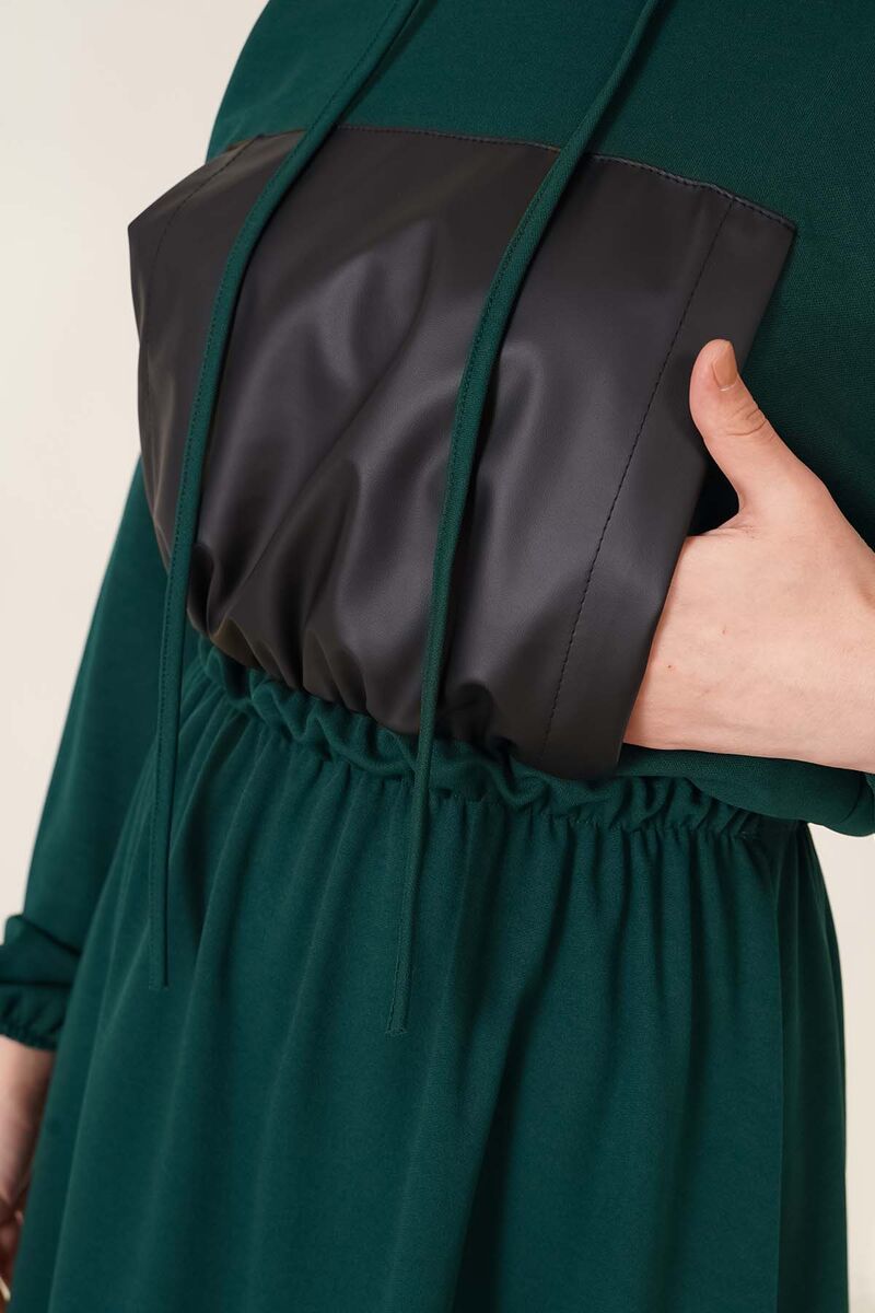 Yeni sezon elbisemiz göğsünde bulunan deri cep detayıyla dikkat çekmektedir. Cep açıklığı yanlardadır. Beli lastikli olan elbisemizin bilekleri de lastiklidir. Kapüşonlu olan elbisemizin kapüşonu iplidir. Düşük omuz model elbisemiz rahat bir şıklığı sizlere sunmaktadır.