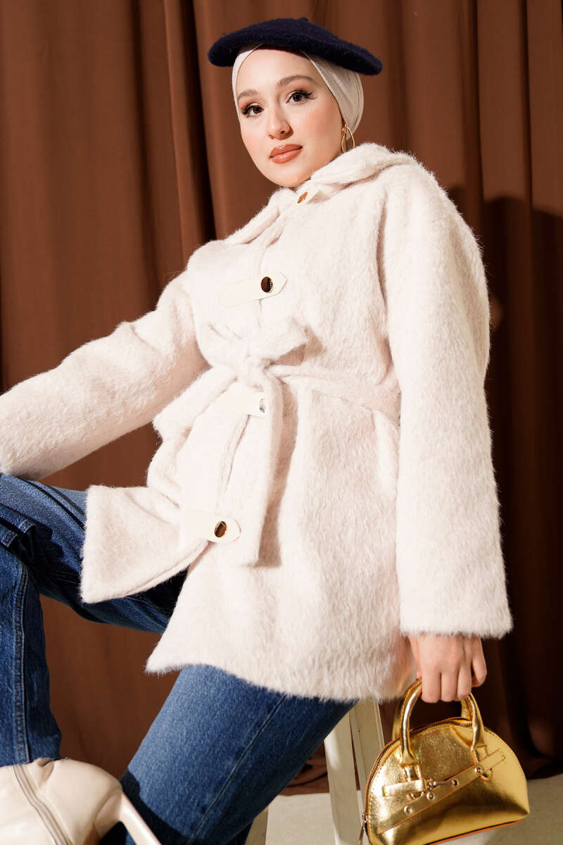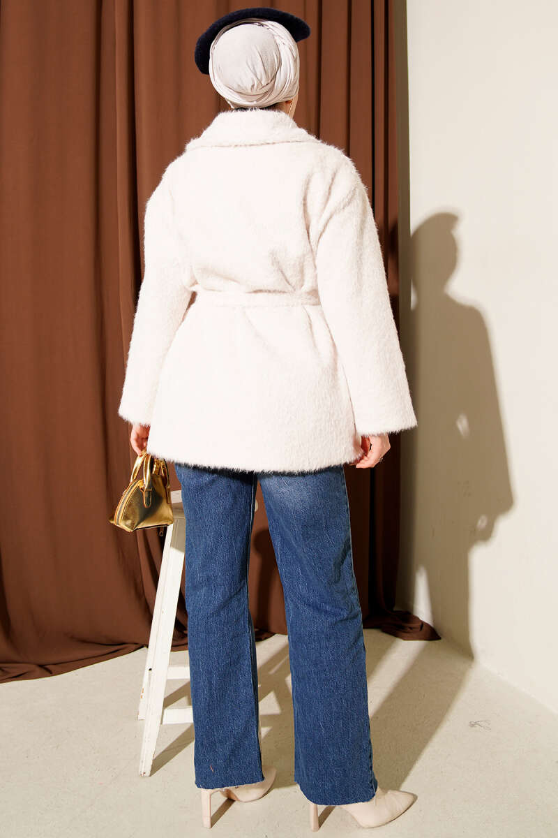 Düğmeli Kuşaklı Tay Tüyü Ceket Vizon