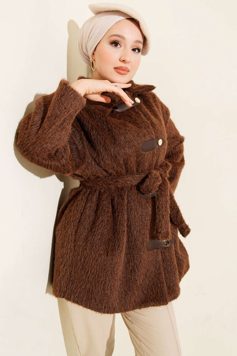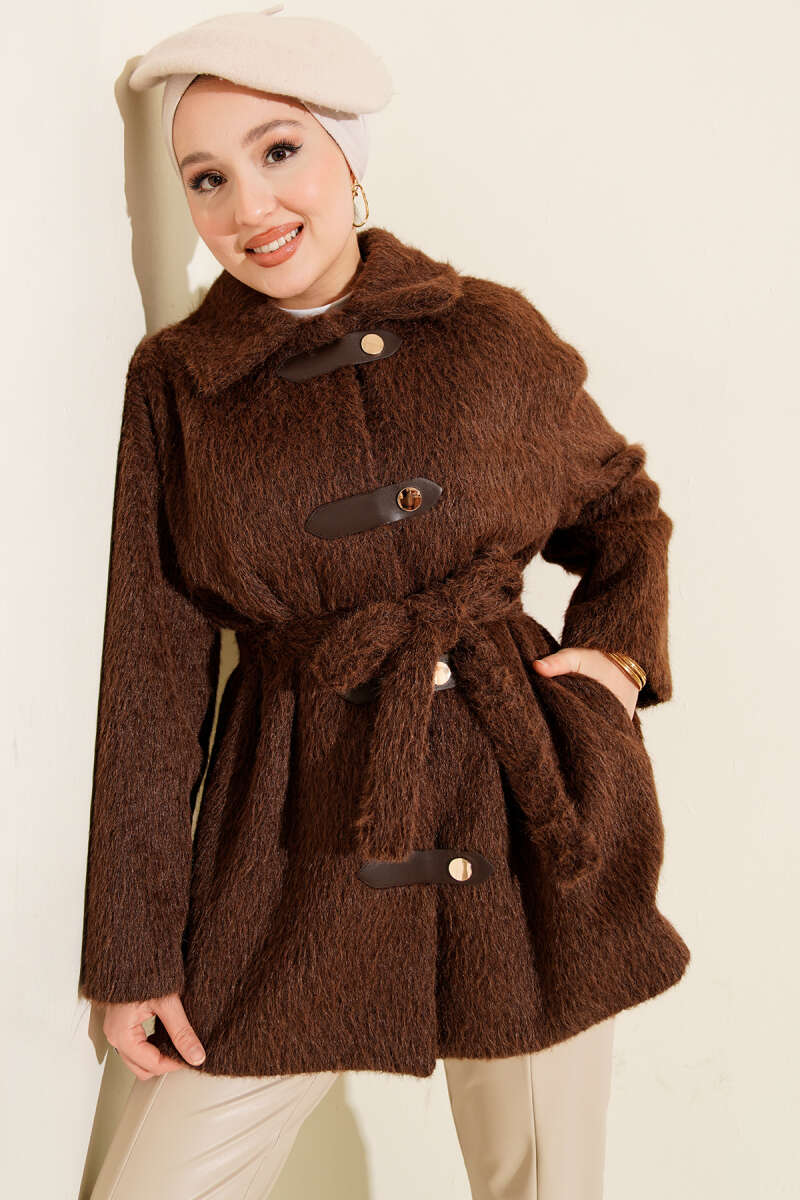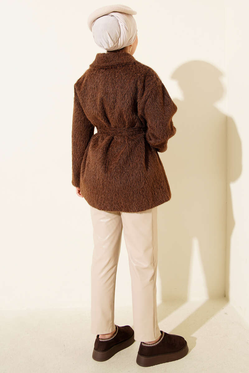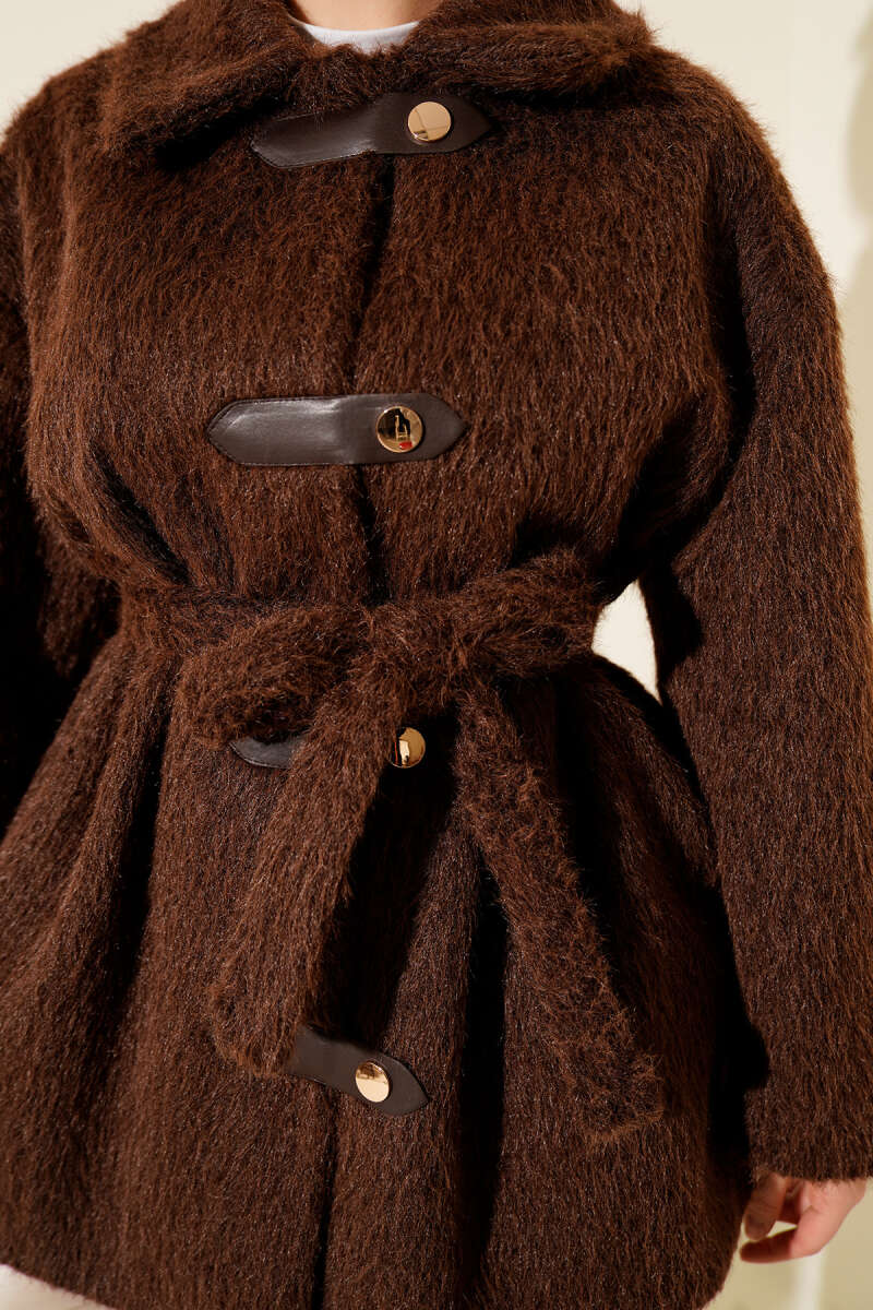 Düğmeli Kuşaklı Tay Tüyü Ceket Vizon