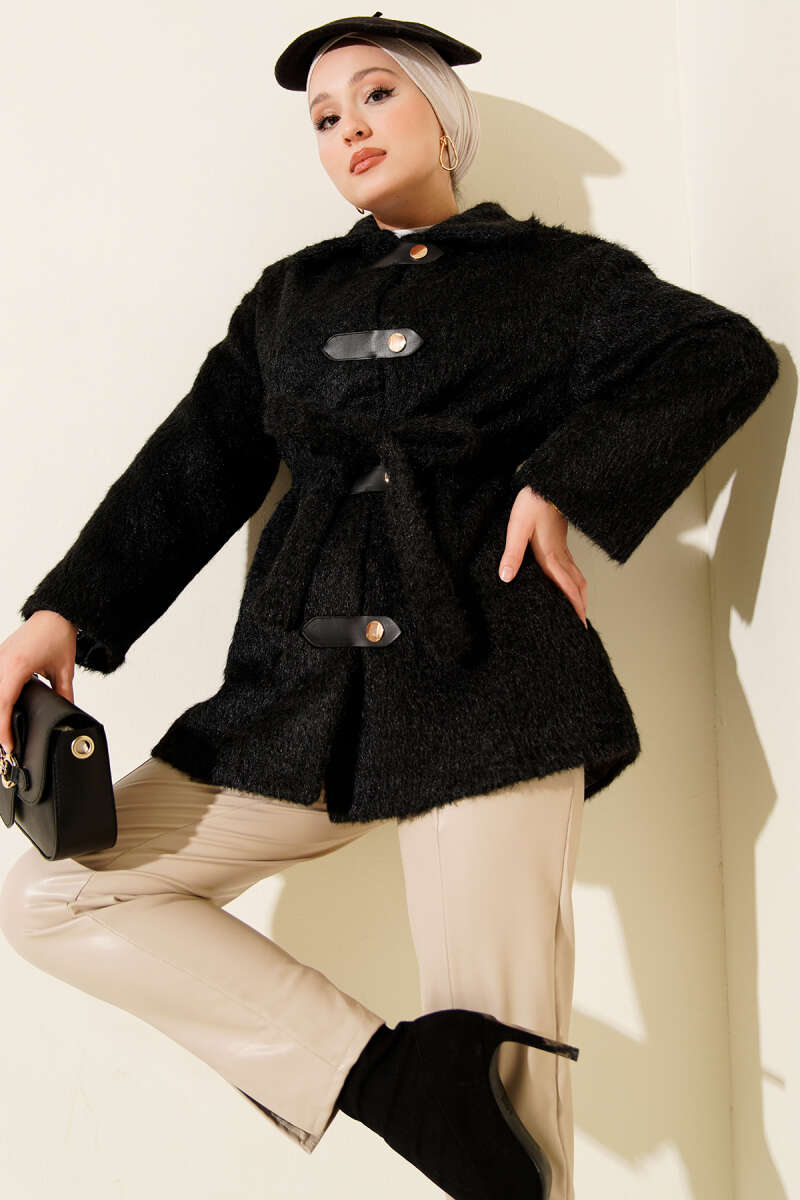 Düğmeli Kuşaklı Tay Tüyü Ceket Lacivert