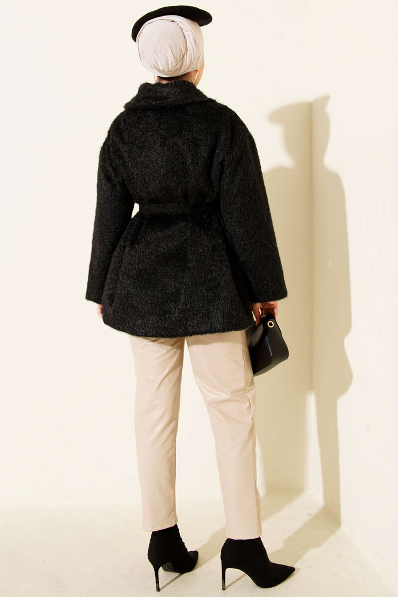 Tek Düğmeli Kuşaklı Süet Ceket Siyah