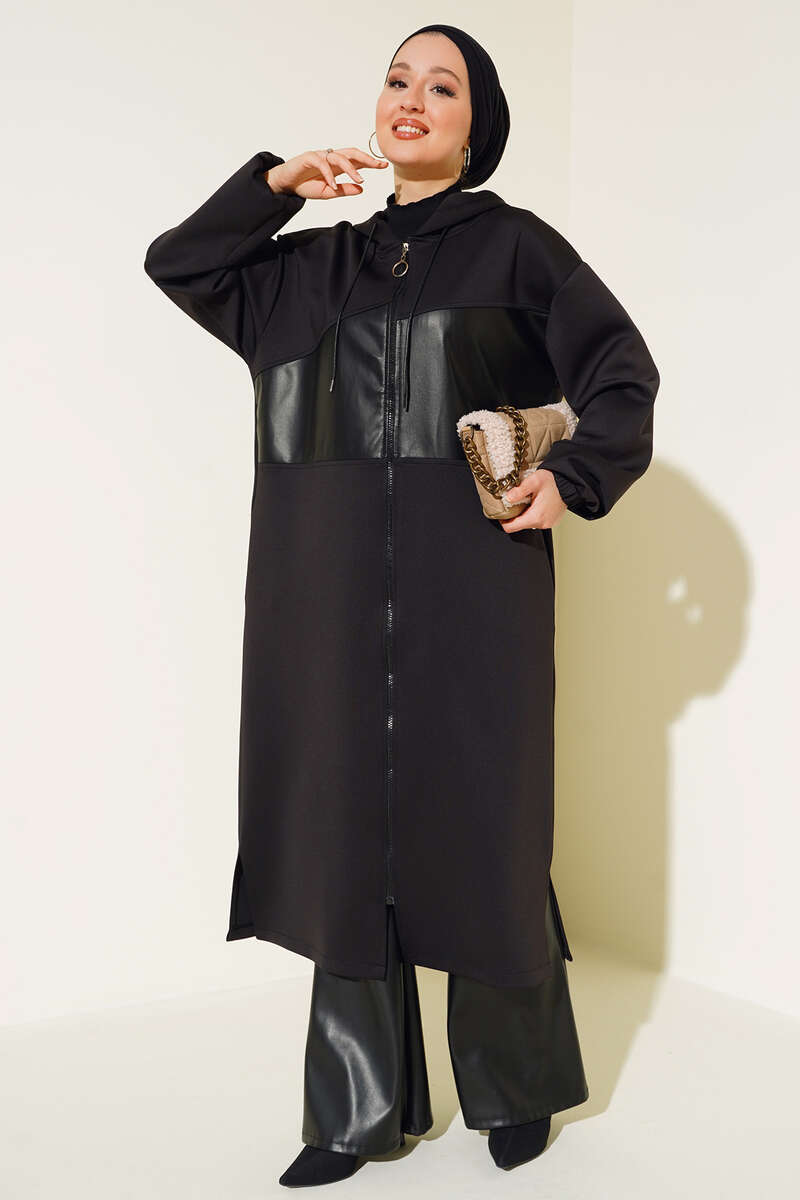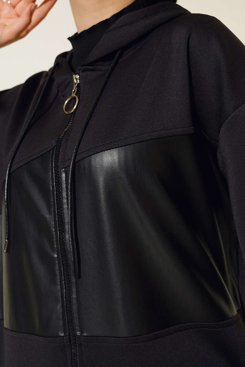 Deri Detaylı Fermuarlı Kap Siyah