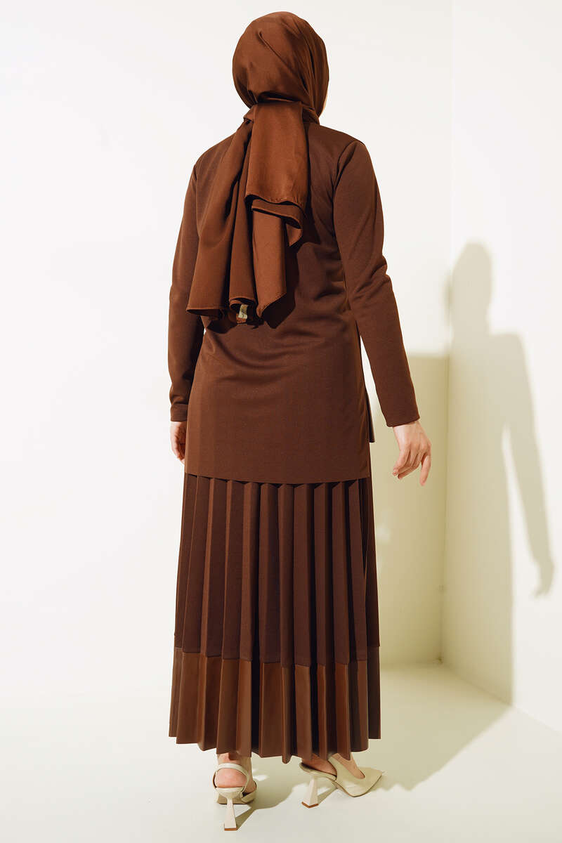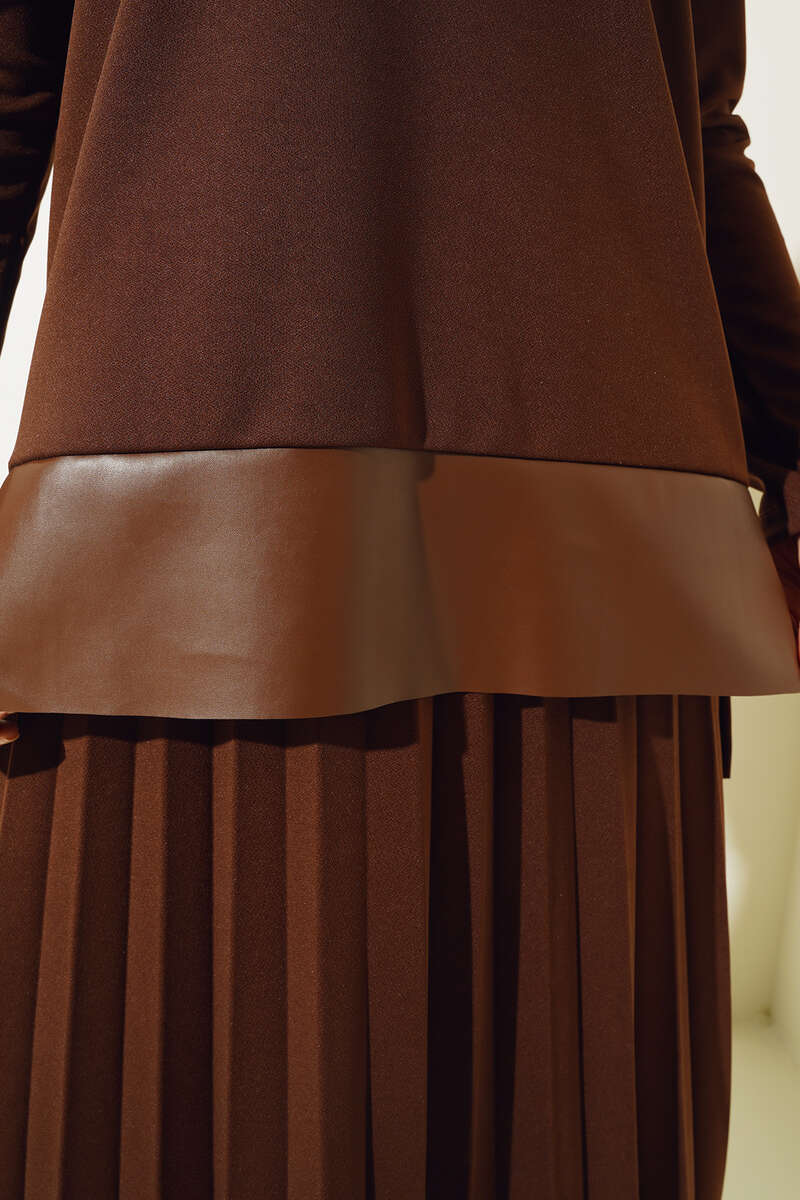 Yeni sezon tunik etek ikili takımımız bu yazın en favori modellerindendir. Tuniğimiz ön kısmı arka kısmına göre kısadır. Oval yaka olan tuniğimiz alt kısmındaki deri detayıyla dikkat çekmektedir. Eteğimiz deri detaylı ve piliselidir.