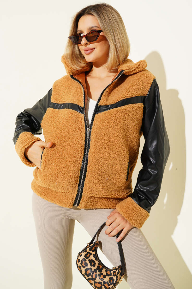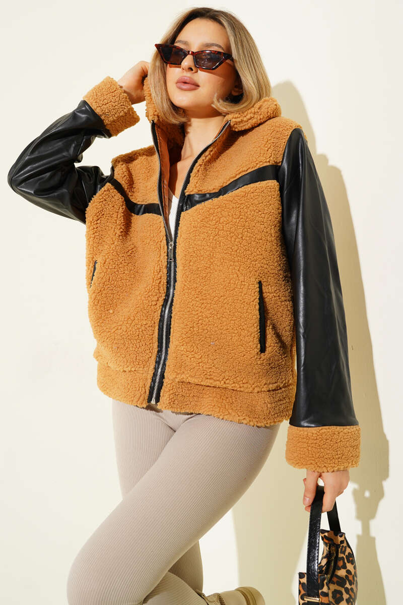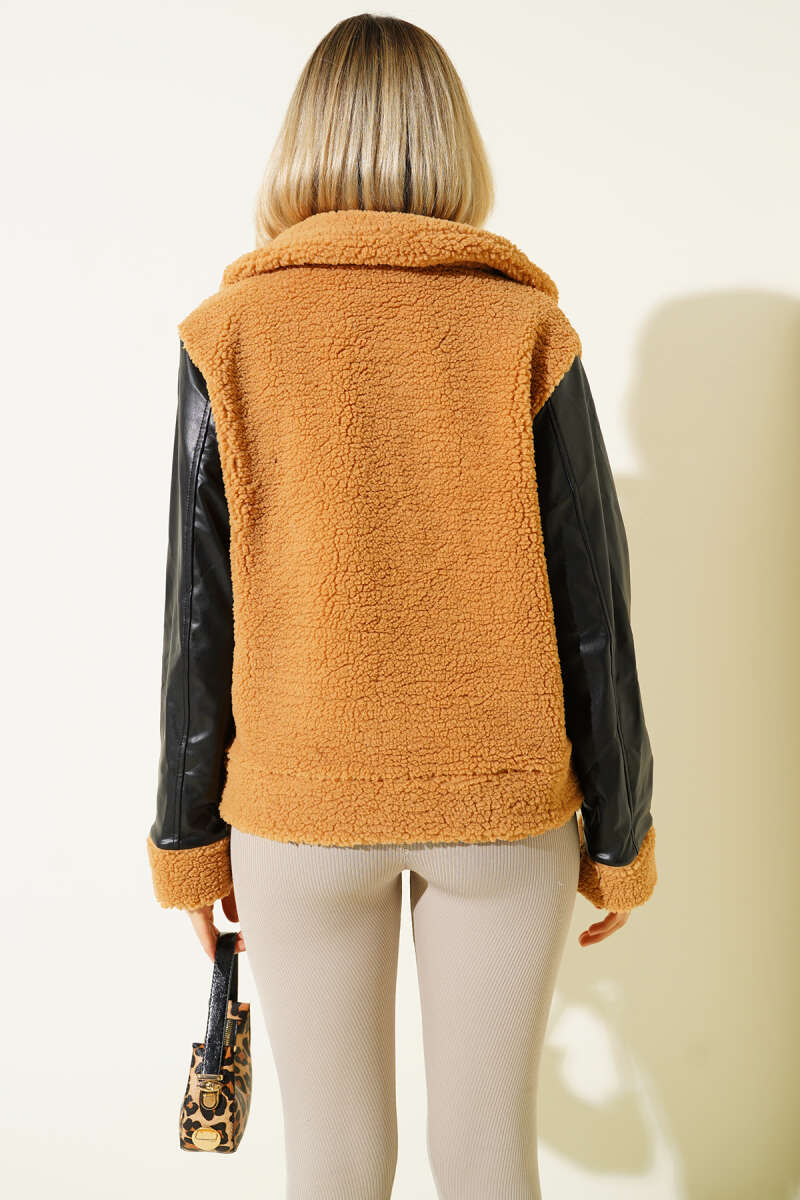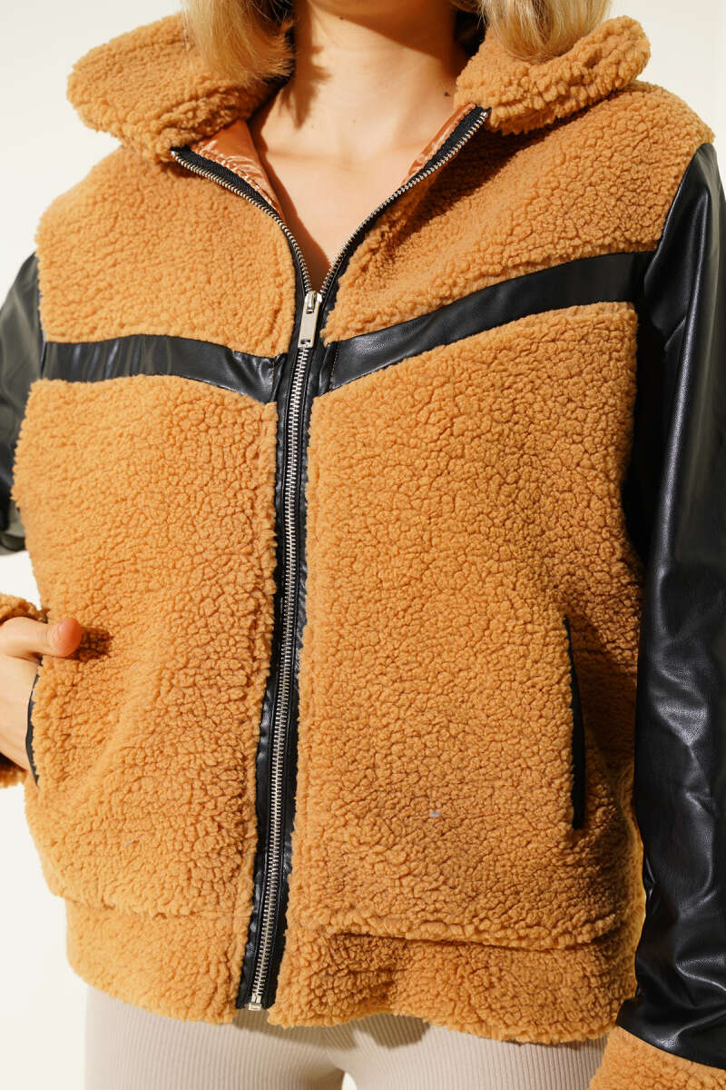 Gold Düğmeli Yan Çizgili Triko Hırka Kahve Bej
