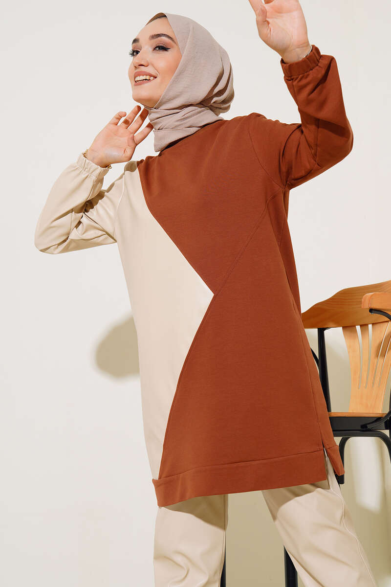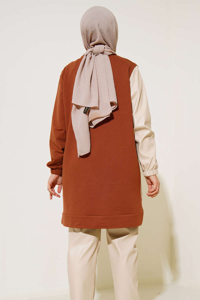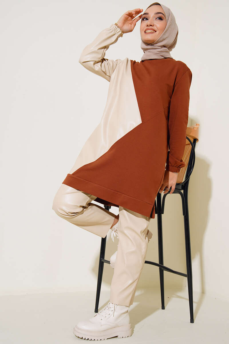 Yeni sezon tuniğimiz deri garnili modeldir. Tuniğimiz oval yaka olup bilekleri lastiklidir. Etek uçları yırtmaçlıdır. Yarısı deri garnili olması tuniğimize şıklık katmaktadır. Kombinlerinizin en şık parçası olacak tuniğimiz dolaplarınızda yerlerini beklemekte.