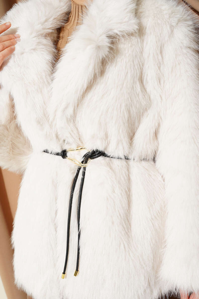Deri İp Kuşaklı Kürk Mont Latte